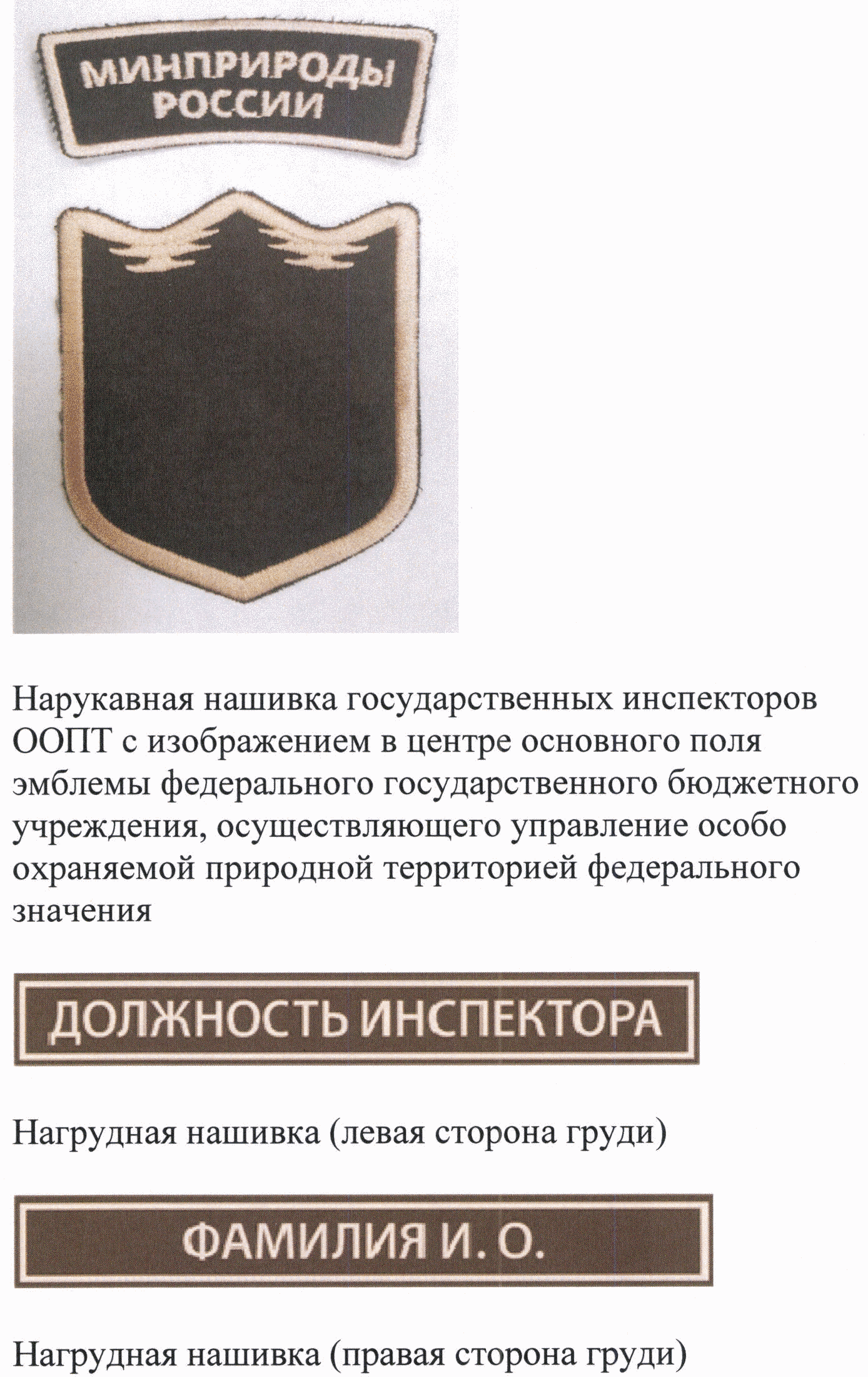 знак принадлежности к Минприроды России - дуговая нашивка на левом рукаве в виде контурной рамки бежевого цвета на поле коричневого цвета с надписью буквами цвета рамки "Минприроды России" на расстоянии 80 мм от верхней точки рукава;