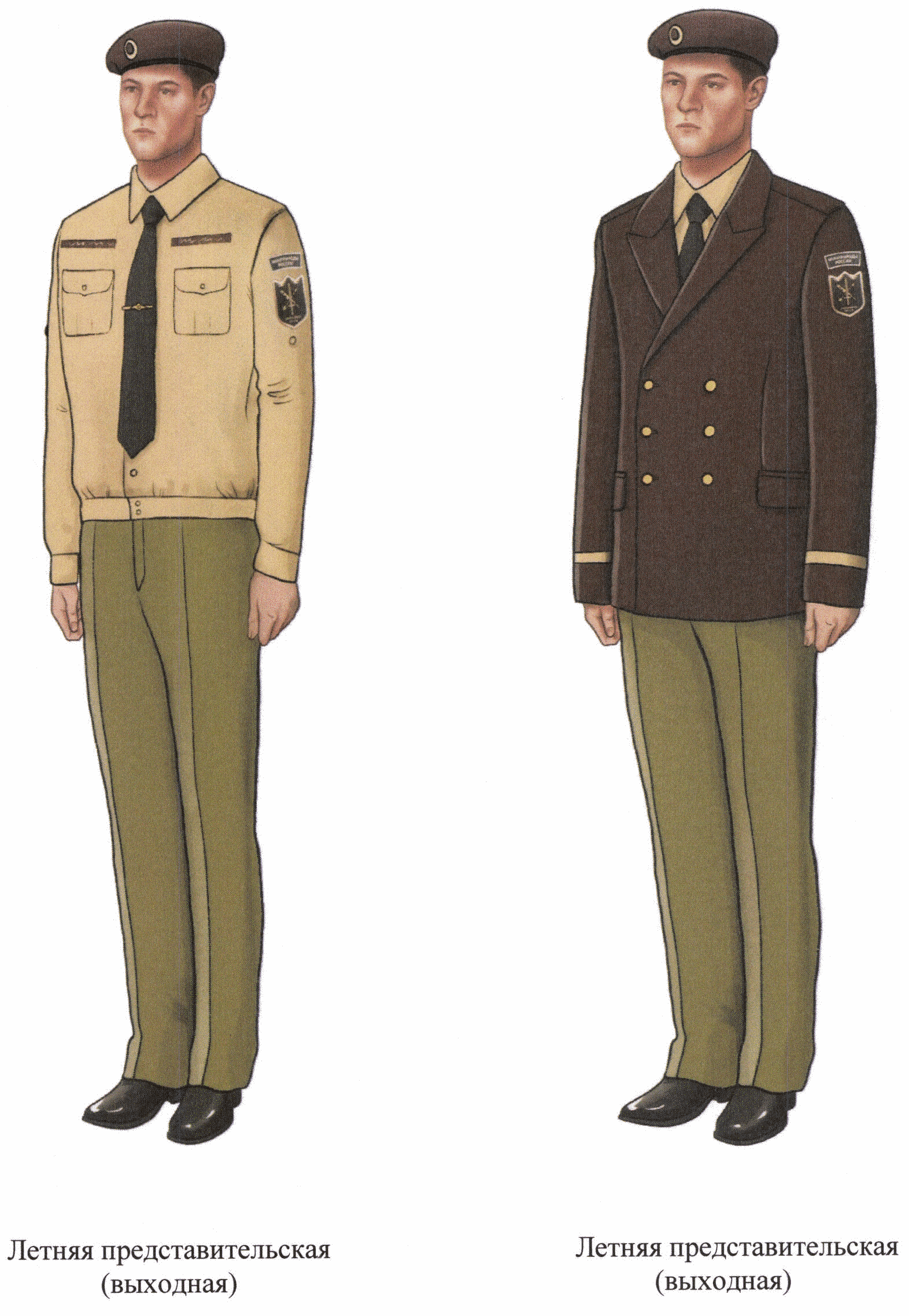 летняя - кепи светло-зеленого цвета или берет коричневого цвета, костюм "тактический" (куртка и брюки) светло-зеленого цвета или брюки костюма "тактический", рубашка-поло бежевого цвета с коротким рукавом или рубашка бежевого цвета с длинным рукавом (с возможностью регулировки), полуботинки (ботинки) или ботинки с высокими берцами;