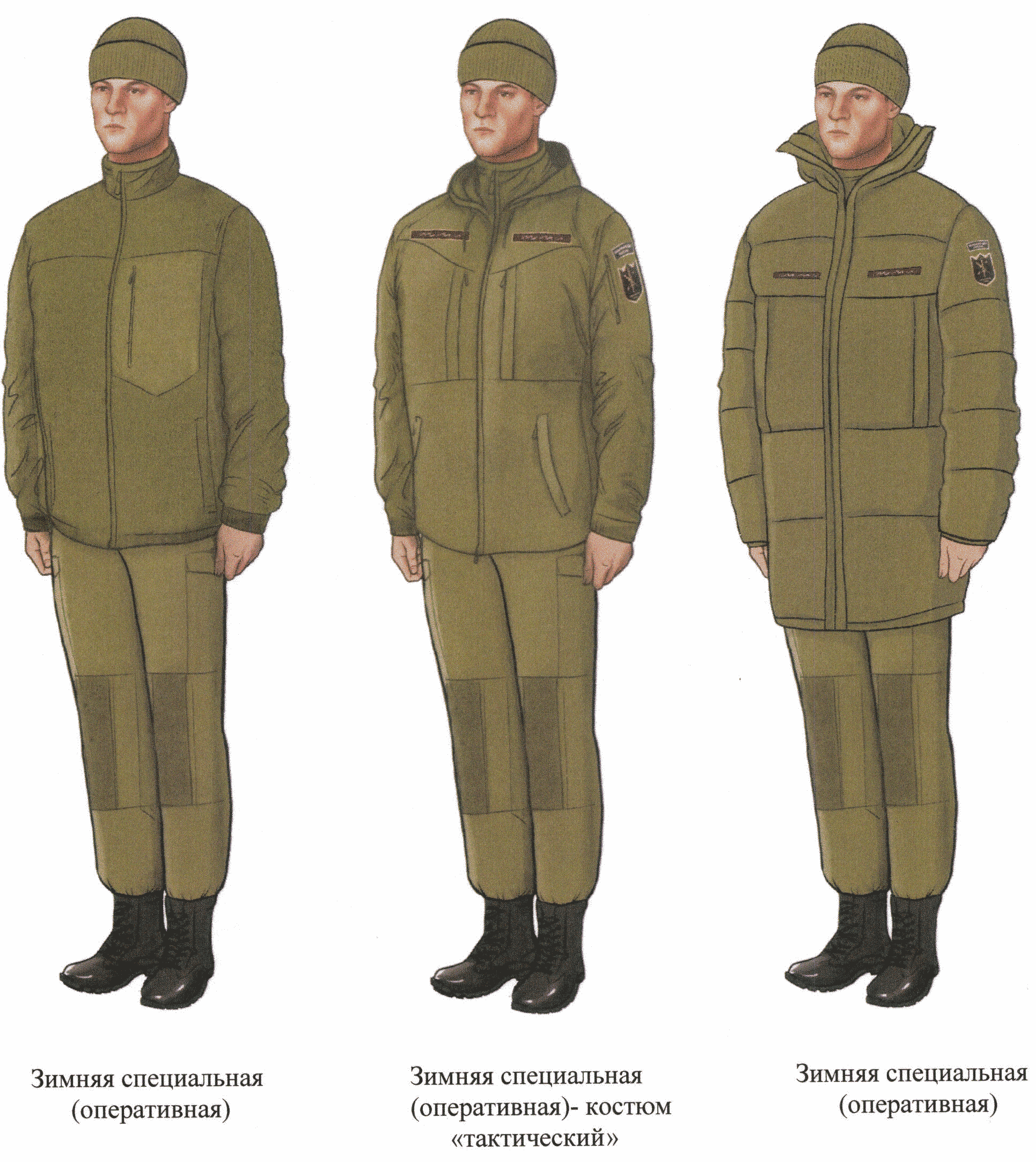 зимняя - шапка "тактическая" флисовая светло-зеленого цвета, комплект "зимний" (куртка и полукомбинезон), кофта флисовая с длинным ворсом или костюм "тактический" светло-зеленого цвета, перчатки черного цвета, шарф светло-зеленого цвета, сапоги зимние или ботинки с высокими берцами или унты;