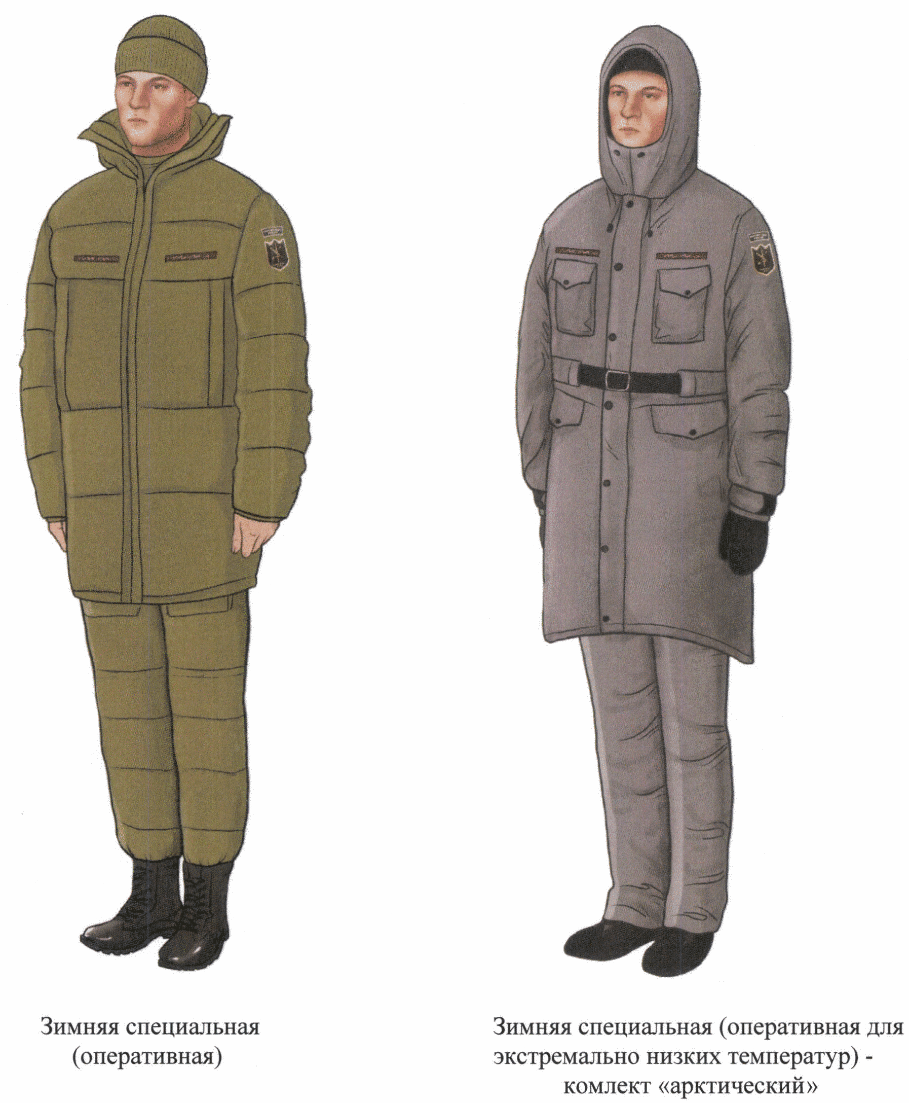 зимняя (для экстремально низких температур) - комплект "арктический" (утепленная шлем-шапка, куртка утепленная, брюки утепленные, рукавицы утепленные серого цвета), сапоги утепленные черного или серого цвета), серого цвета, кофта флисовая с длинным ворсом, костюм "тактический" светло-зеленого цвета.