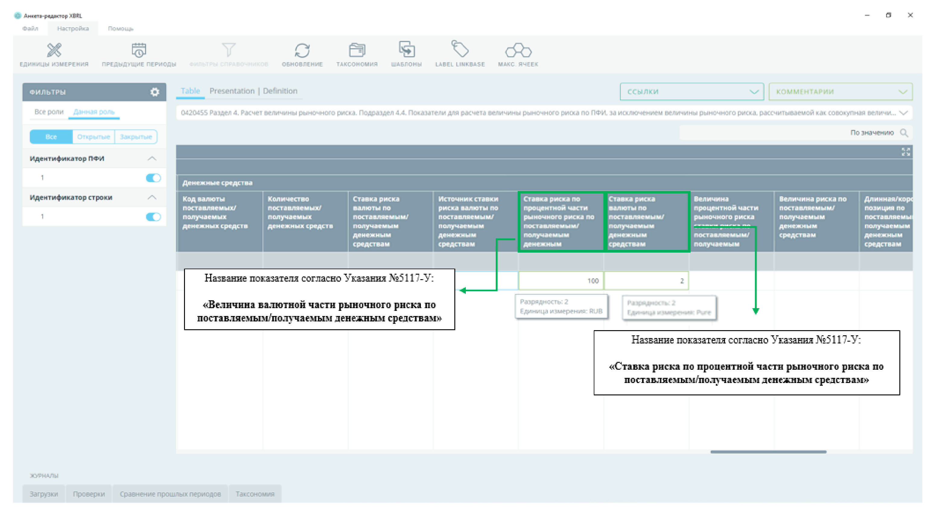 При формировании подраздела 4.4 раздела 4 "Расчет величины рыночного риска. Показатели для расчета величины рыночного риска по ПФИ, за исключением величины рыночного риска, рассчитываемой как совокупная величина индивидуального клирингового обеспечения" отчетности по форме 0420455 "Расчет показателя достаточности капитала", установленной в приложении 1 к Указанию N 5117-У1, для показателей с кодом purcb-dic:Velich_val_riska_ds и purcb-dic:Stavka_riska_ds необходимо формировать отчетность, руководствуясь наименованиями показателей, установленными Указанием N 5117-У.