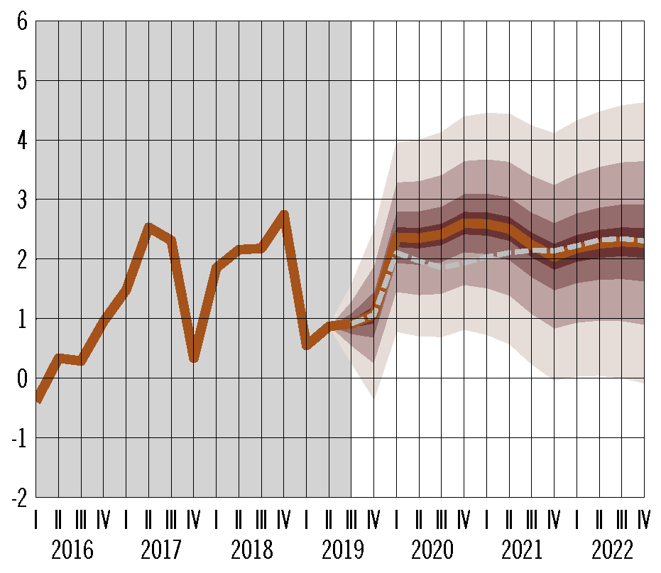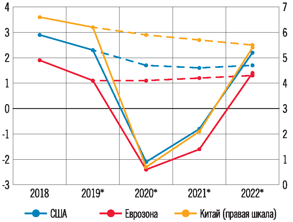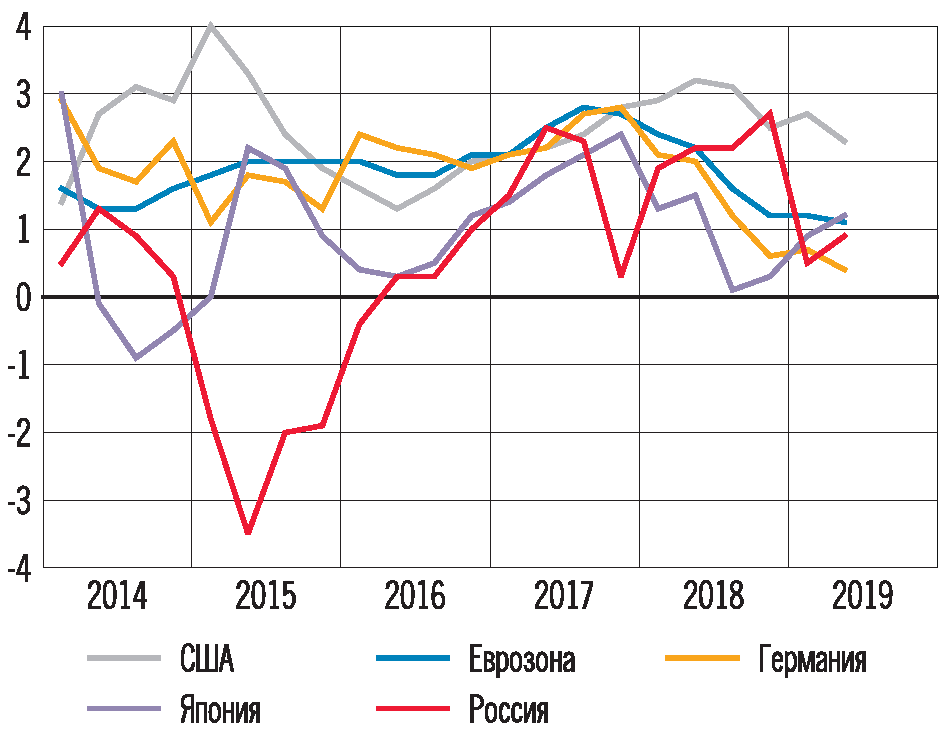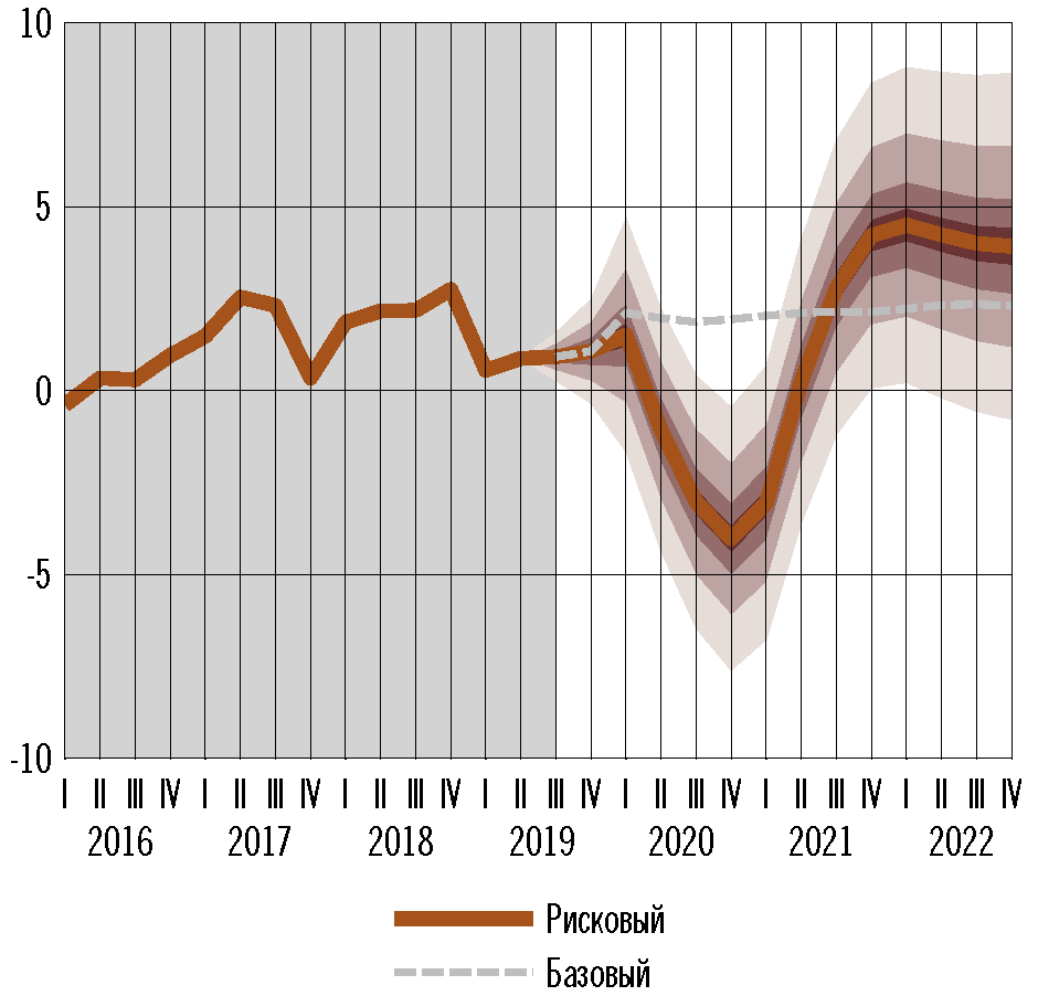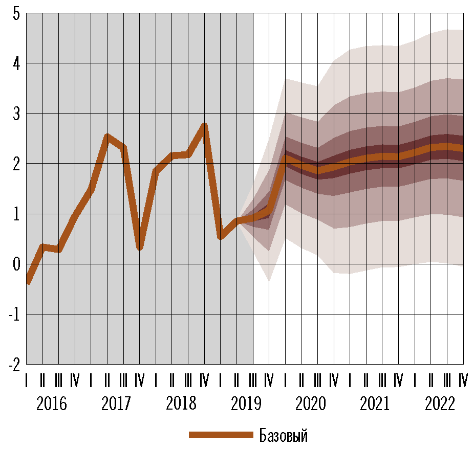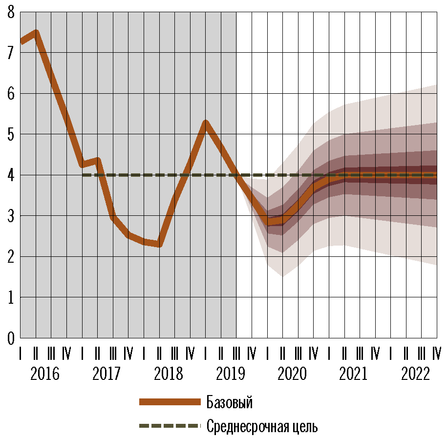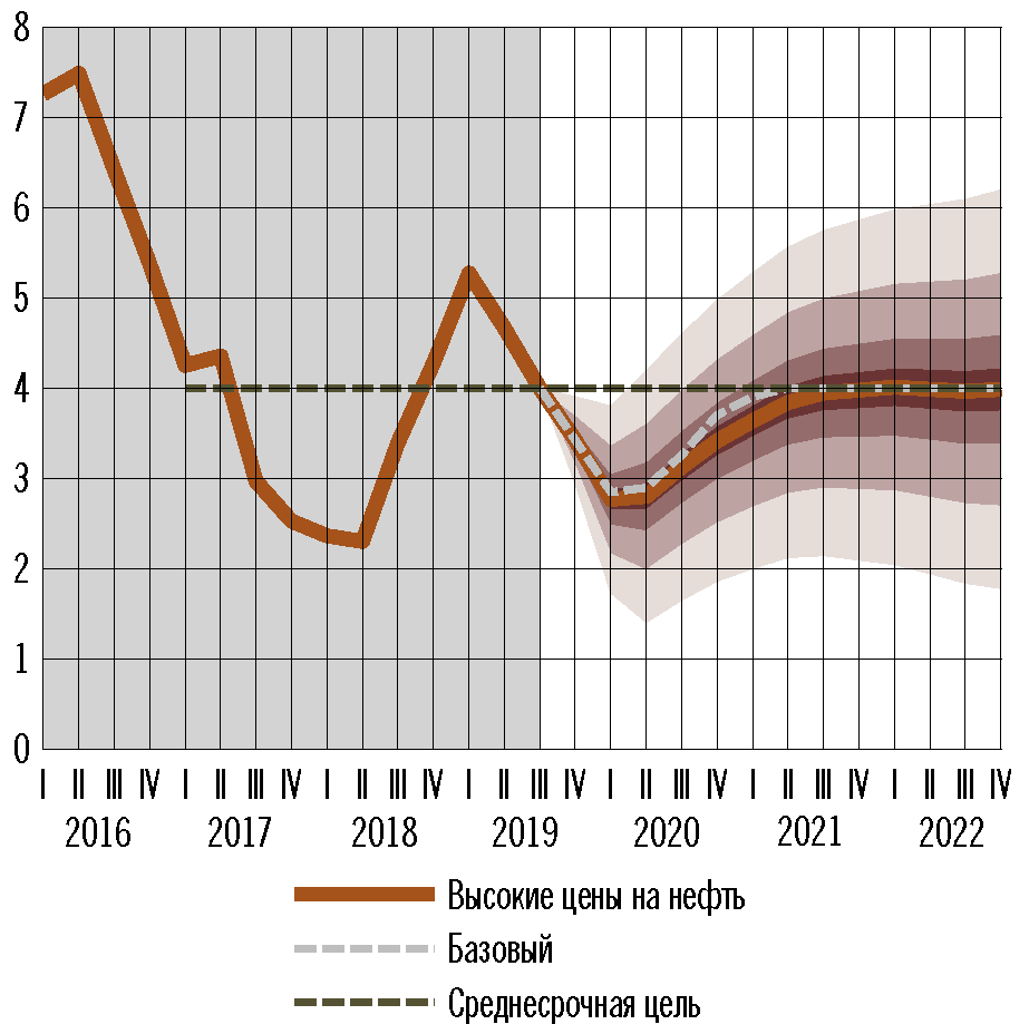 При этом Банк России придает особое значение факторам, которые будут оказывать существенное влияние на развитие российской экономики и динамику инфляции на прогнозном горизонте. В числе внешних факторов - перспективы роста мировой экономики, которые существенно ухудшились на фоне усиления торговых противоречий и действия иных геополитических факторов в 2019 году. Среди внутренних факторов - подходы к проведению бюджетной политики, в том числе к использованию ликвидной части Фонда национального благосостояния сверх 7% ВВП. При этом темпы и структура экономического роста на трехлетнем горизонте, а также характер влияния экономической динамики на инфляцию будут в значительной мере зависеть от хода реализации национальных проектов и эффектов других структурных мер. Эти внутренние и внешние факторы учтены Банком России как при расчете базового сценария прогноза, оценке рисков для него, так и при подготовке дополнительных сценариев.