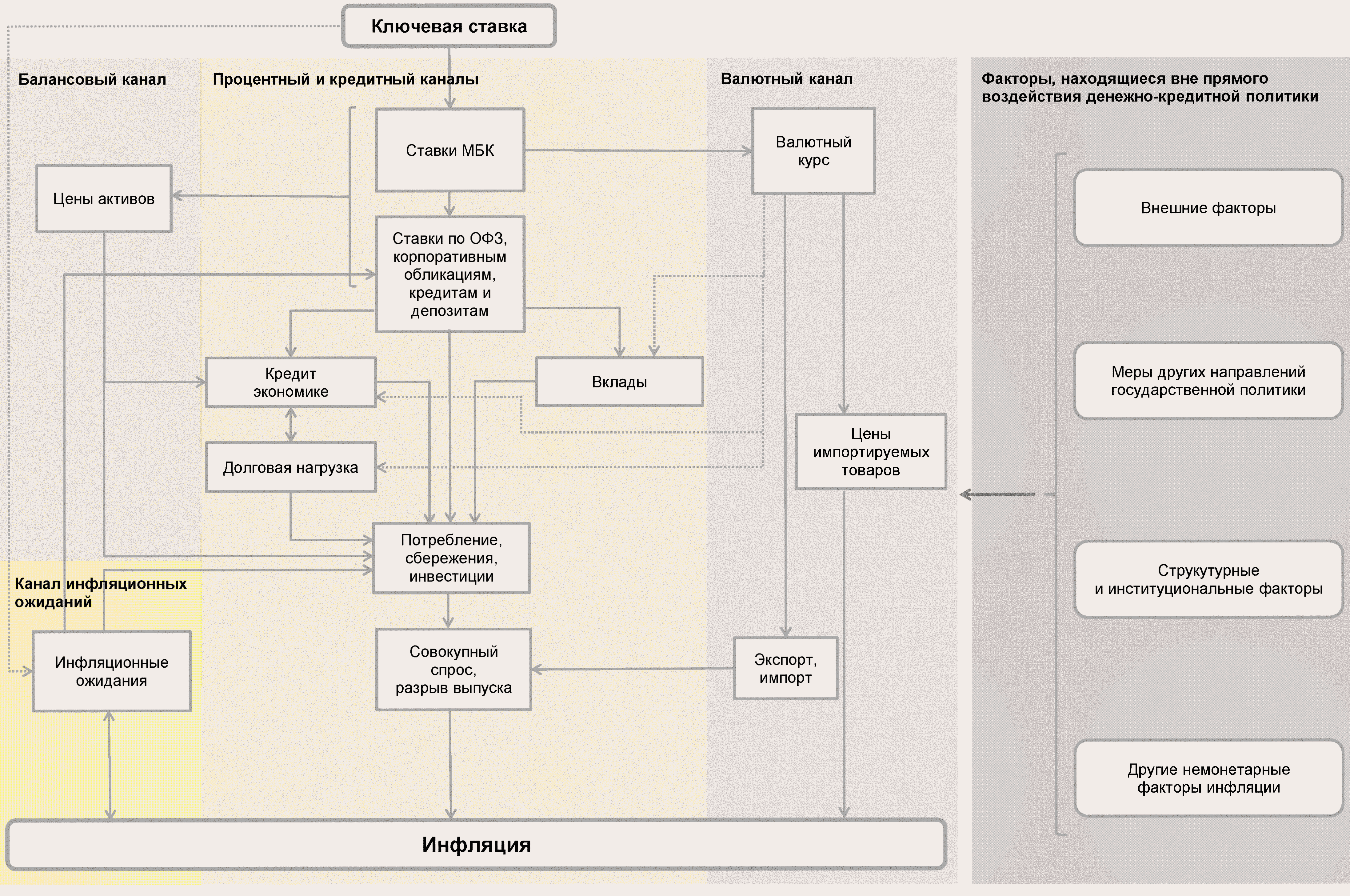 Механизм влияния решений в области денежно-кредитной политики на экономику в целом и ценовую динамику в частности; процесс постепенного распространения сигнала центрального банка о сохранении или изменении ключевой ставки и будущей ее траектории от сегментов финансового рынка на реальный сектор экономики и в итоге на инфляцию. Изменение уровня ключевой ставки транслируется в экономику по различным каналам (процентному, кредитному, валютному, балансовому, каналу инфляционных ожиданий и другим).
