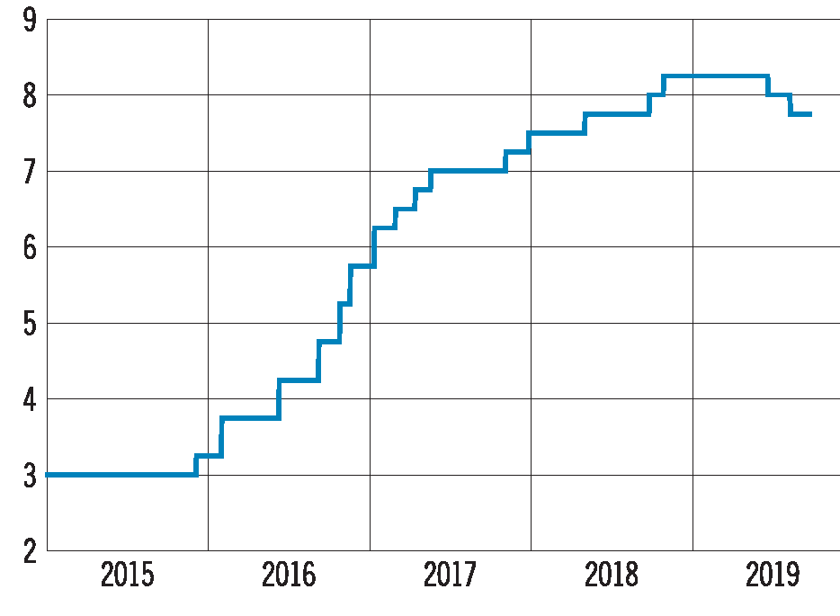 | Операции на открытом рынке (минимальные процентные ставки) | Аукционы по предоставлению кредитов, обеспеченных нерыночными активами3 | 3 месяца | Ежемесячно4 | 8,00 | 7,75 | 7,50 | 7,25 | 6,75 | Ключевая ставка + 0,25 | |