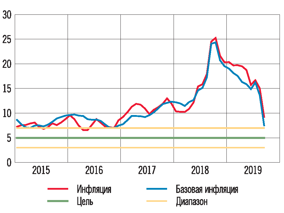 Целью денежно-кредитной политики является поддержание годовой инфляции вблизи 4% постоянно. Формулировка "вблизи 4%" отражает допустимость небольших колебаний инфляции вокруг цели. Данные колебания носят естественный характер, учитывая, что цены формируются под влиянием множества факторов и в экономике действует сложная цепочка взаимосвязей. При этом денежно-кредитная политика воздействует на динамику цен не напрямую, а опосредованно и в течение определенного времени, поэтому ее мерами невозможно обеспечить достижение цели с абсолютной точностью.