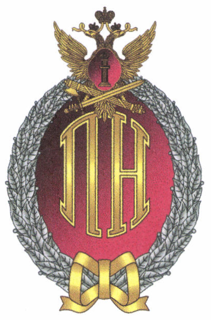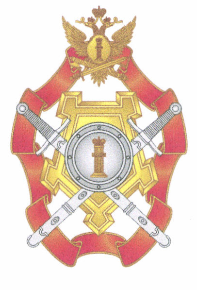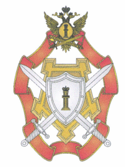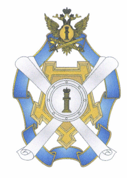 Лента, крепость, двуглавый орел, перекрещенные мечи в ножнах, щит и "столп Закона" располагаются в разных плоскостях.
