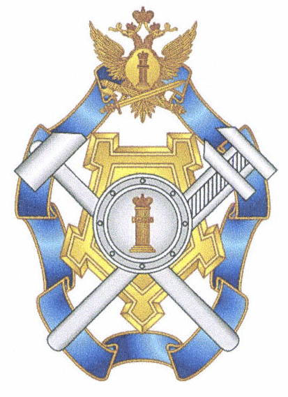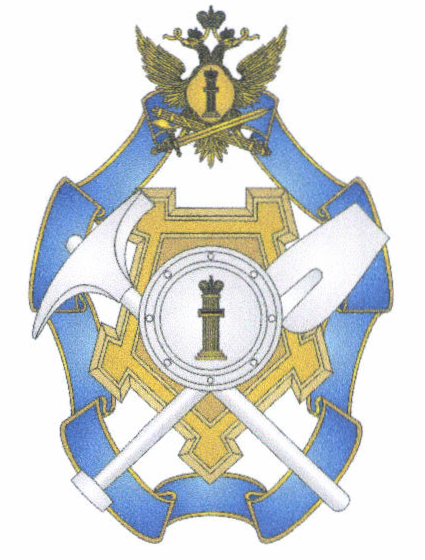 Лента, крепость, двуглавый орел и "столп Закона" изготавливаются из томпака, шестеренка с молниями, перекрещенные меч с ключом и щит - из патинированного нейзильбера. На ленту наносится прозрачная синяя силикатная эмаль, на поле щита, расположенного на груди орла, - прозрачная рубиновая органическая эмаль.