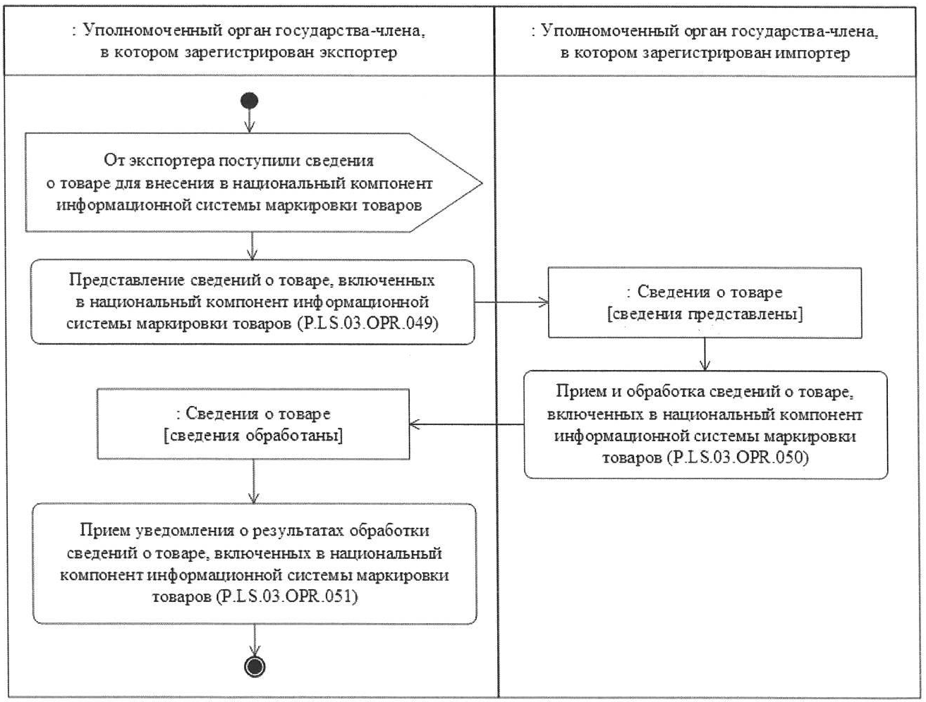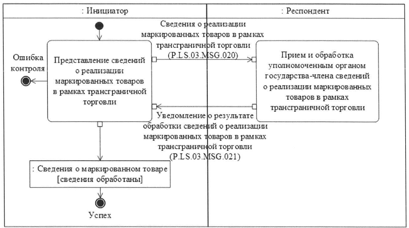 | 4.1 | Представление сведений о реализации маркированных товаров в рамках трансграничной торговли (P.LS.03.OPR.043). Прием уведомления о результате обработки сведений о реализации маркированных товаров в рамках трансграничной торговли (P.LS.03.OPR.045) | сведения о маркированном товаре (P.LS.03.BEN.004): сведения представлены | прием и обработка уполномоченным органом государства-члена, в котором зарегистрирован импортер, сведений о реализации маркированных товаров в рамках трансграничной торговли (P.LS.03.OPR.044) | сведения о маркированном товаре (P.LS.03.BEN.004): сведения обработаны | представление сведений о реализации экспортером (продавцом) маркированных товаров в рамках трансграничной торговли (P.LS.03.TRN.014) |