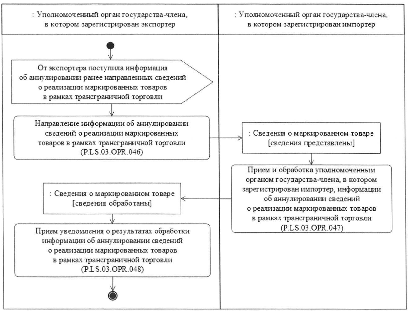 | 5.1 | Направление информации об аннулировании сведений о реализации маркированных товаров в рамках трансграничной торговли (P.LS.03.OPR.046). Прием уведомления о результате обработки информации об аннулировании сведений о реализации маркированных товаров в рамках трансграничной торговли (P.LS.03.OPR.048) | сведения о маркированном товаре (P.LS.03.BEN.004): сведения представлены | прием и обработка уполномоченным органом государства-члена, в котором зарегистрирован импортер, информации об аннулировании сведений о реализации маркированных товаров в рамках трансграничной торговли (P.LS.03.OPR.047) | сведения о маркированном товаре (P.LS.03.BEN.004): сведения обработаны | информирование об аннулировании сведений о реализации маркированных товаров в рамках трансграничной торговли (P.LS.03.TRN.015) |