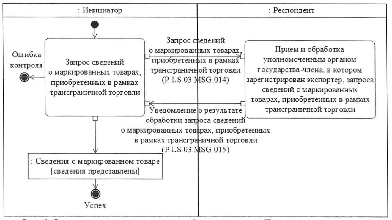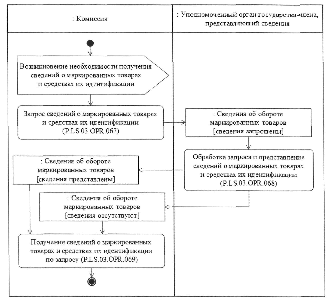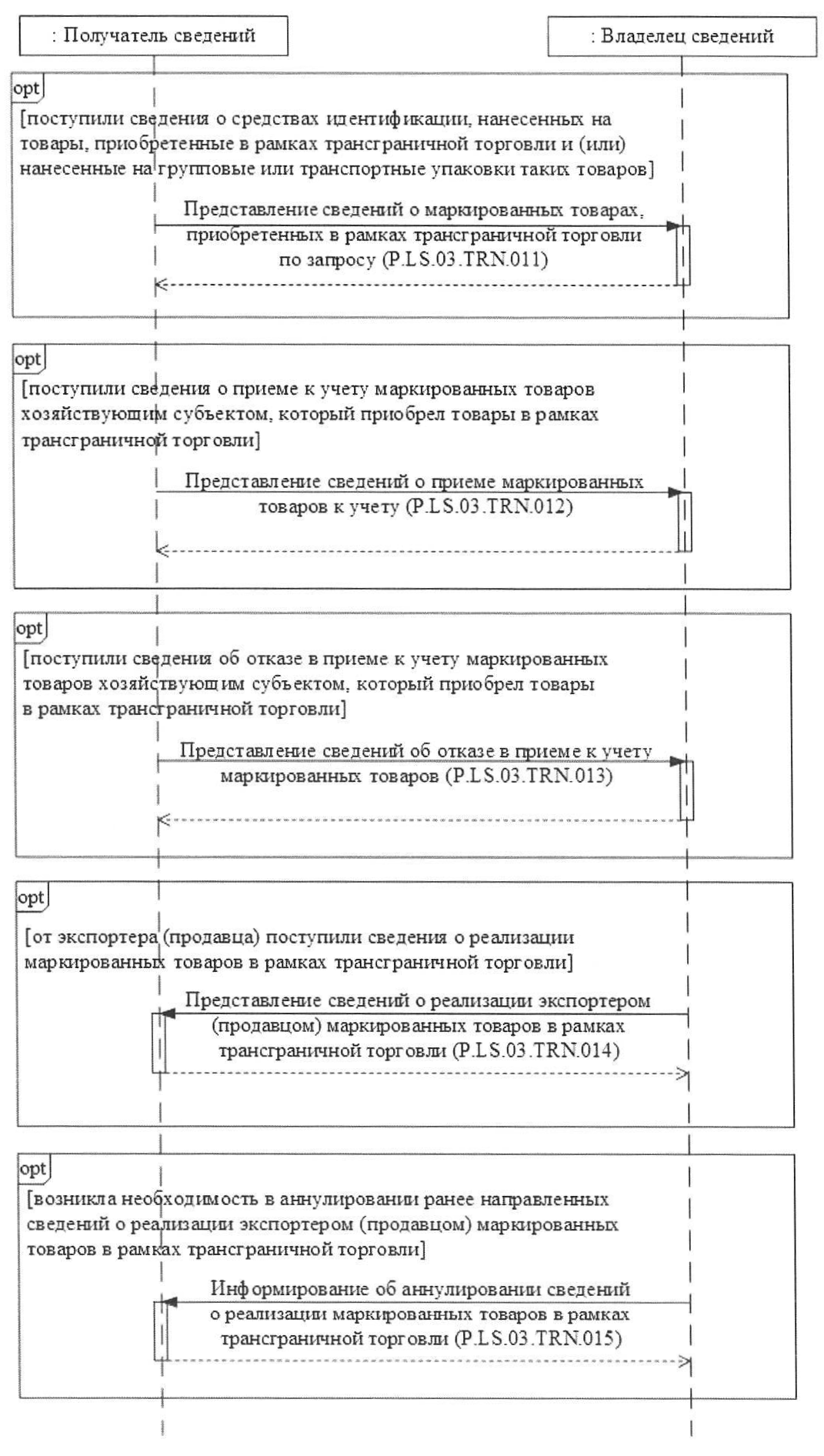 | 1.1 | Запрос сведений о маркированных товарах, приобретенных в рамках трансграничной торговли (P.LS.03.OPR.034). Прием сведений о маркированных товарах, приобретенных в рамках трансграничной торговли (P.LS.03.OPR.036) | сведения о маркированном товаре (P.LS.03.BEN.004): сведения запрошены | прием и обработка уполномоченным органом государства-члена, в котором зарегистрирован экспортер, запроса сведений о маркированных товарах, приобретенных в рамках трансграничной торговли (P.LS.03.OPR.035) | сведения о маркированном товаре (P.LS.03.BEN.004): сведения представлены | представление сведений о маркированных товарах, приобретенных в рамках трансграничной торговли, по запросу (P.LS.03.TRN.011) |
