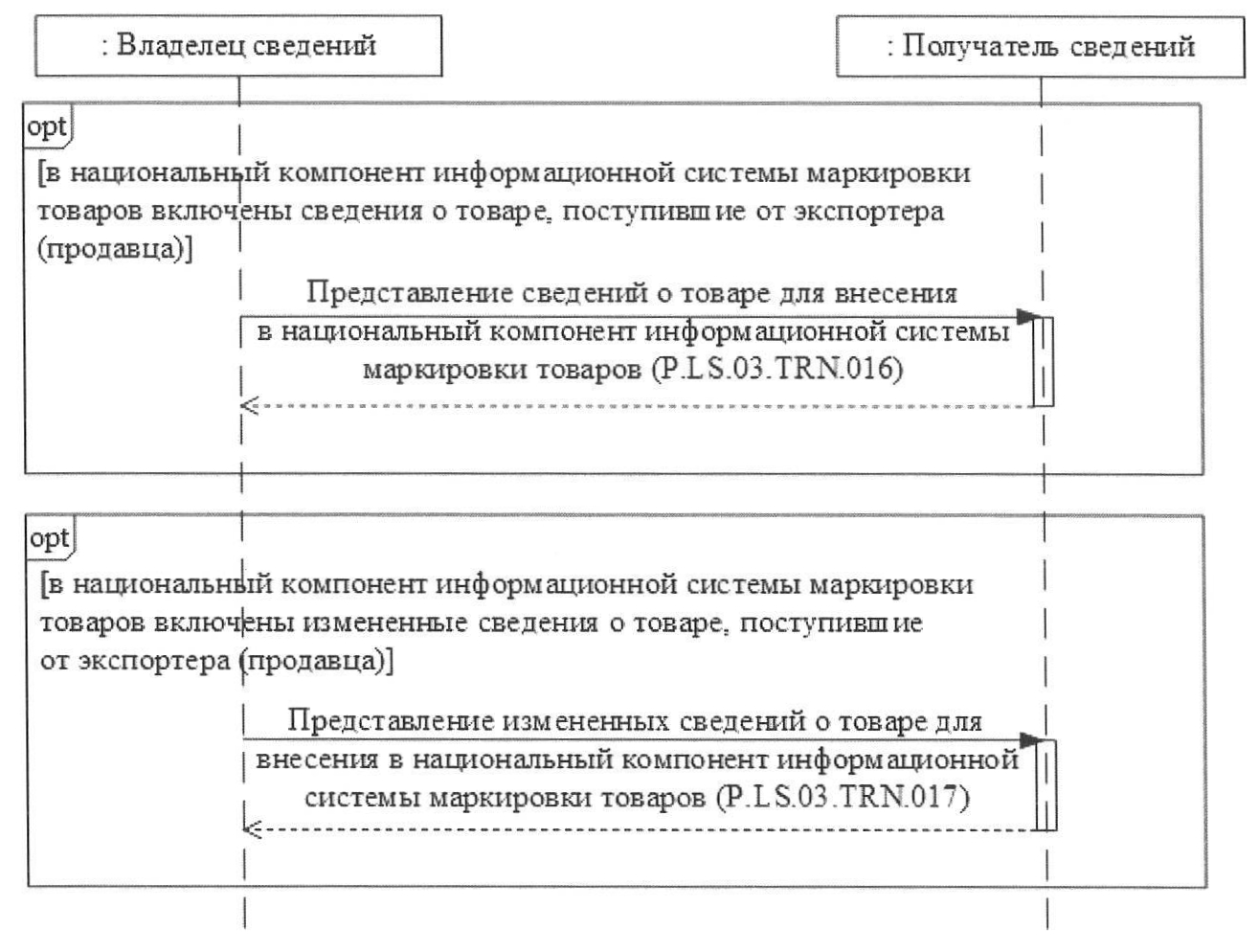 | 2.1 | Представление измененных сведений о товаре, включенных в национальный компонент информационной системы маркировки товаров (P.LS.03.OPR.052); прием уведомления о результате обработки измененных сведений о товаре, включенных в национальный компонент информационной системы маркировки товаров (P.LS.03.OPR.054) | сведения о товаре (P.LS.03.BEN.005): измененные сведения представлены | прием и обработка измененных сведений о товаре, включенных в национальный компонент информационной системы маркировки товаров (P.LS.03.OPR.053) | сведения о товаре (P.LS.03.BEN.005): измененные сведения обработаны | представление измененных сведений о товаре для внесения в национальный компонент информационной системы маркировки товаров (P.LS.03.TRN.017) |