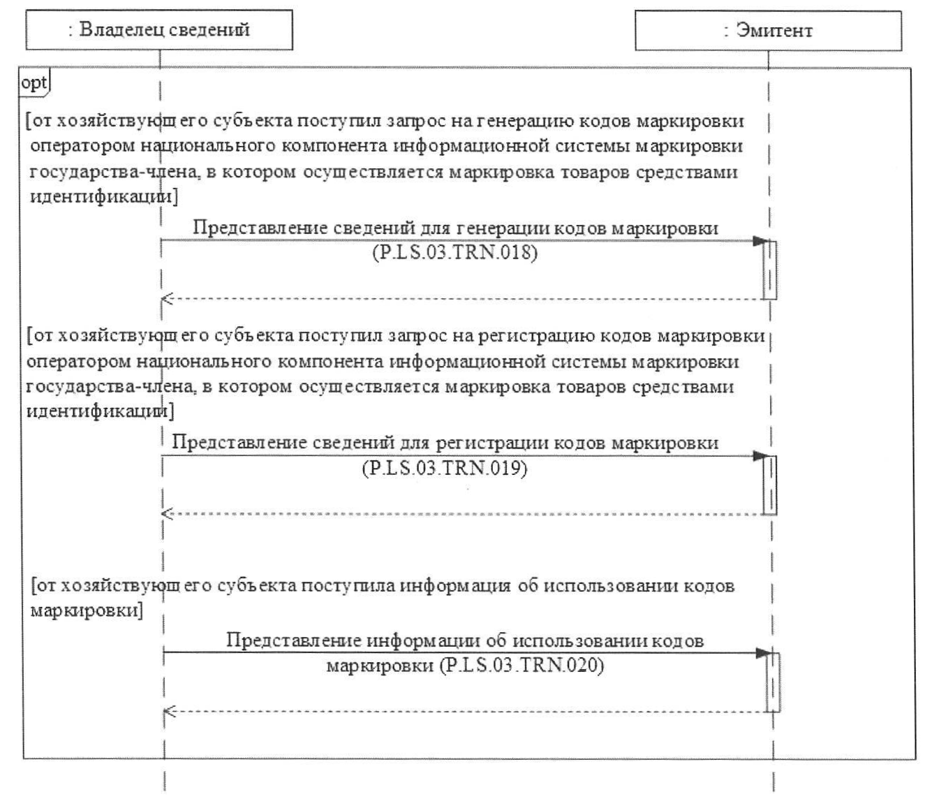 | 2.1 | Представление сведений для регистрации кодов маркировки по запросу хозяйствующего субъекта (P.LS.03.OPR.061); Прием уведомления о результатах обработки сведений для регистрации кодов маркировки (P.LS.03.OPR.063) | сведения о кодах маркировки (P.LS.03.BEN.006): регистрация кодов маркировки запрошена | прием и обработка сведений для регистрации кодов маркировки (P.LS.03.OPR.062) | сведения о кодах маркировки (P.LS.03.BEN.006): сведения о кодах маркировки обработаны | представление сведений для регистрации кодов маркировки (P.LS.03.TRN.019) |