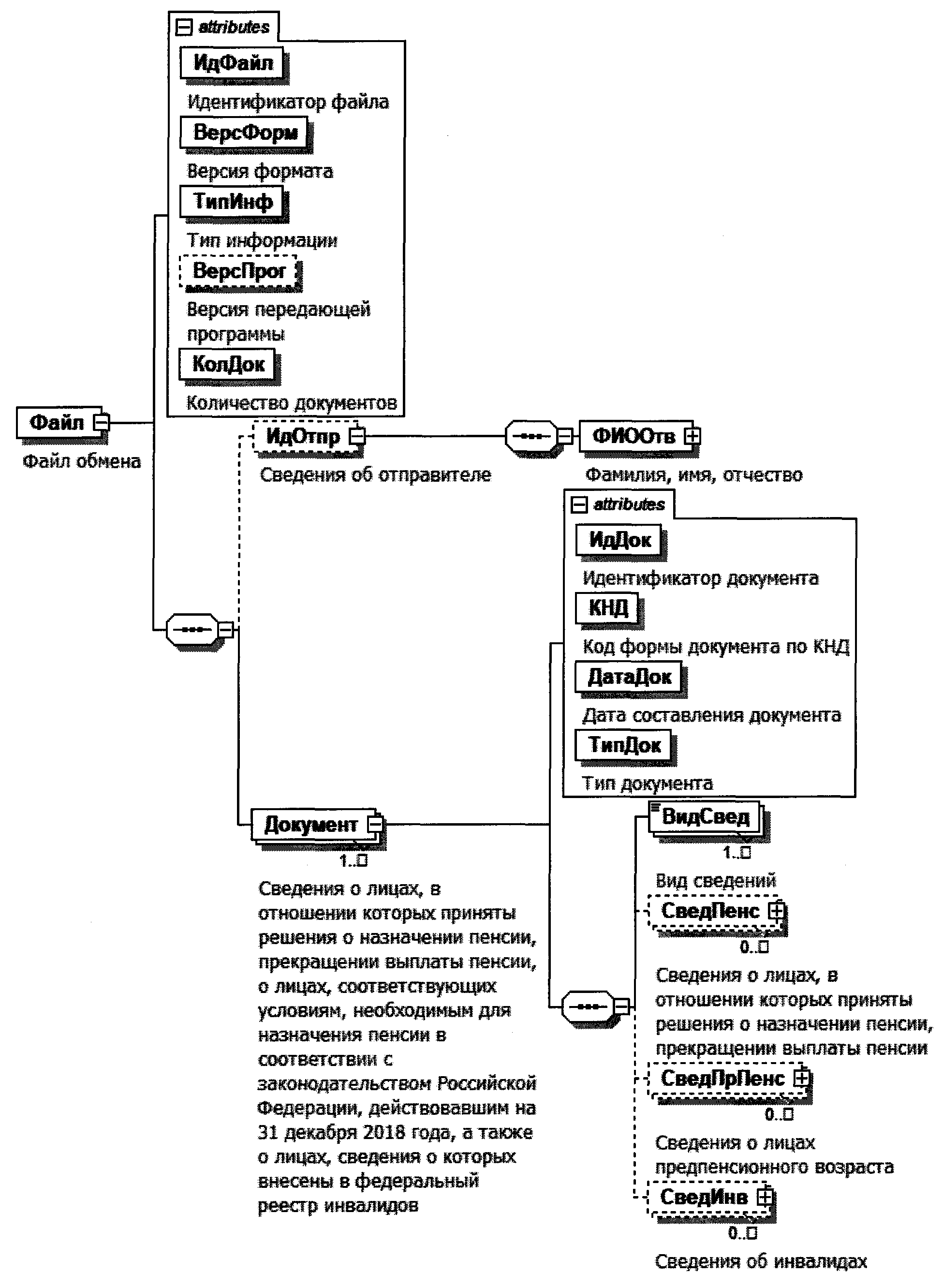 | Сведения о лицах, в отношении которых приняты решения о назначении пенсии, прекращении выплаты пенсии | СведПенс | С | НМ | Состав элемента представлен в таблице 4.4. Элемент является обязательным при <ВидСвед>=01 | |