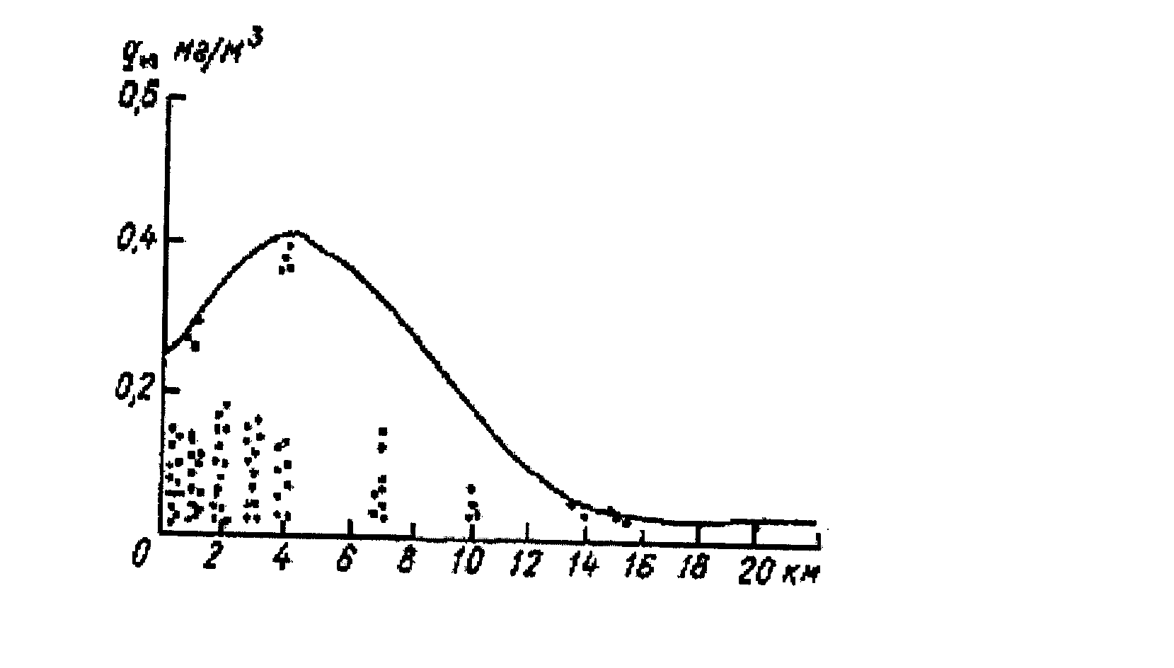 На график наносятся данные наблюдений за концентрациями этого загрязняющего вещества на пунктах наблюдений, находящихся на соответствующих расстояниях от источника выбросов. Далее проводится плавная линия, огибающая сверху основную массу точек, и определяется наибольшее значение (