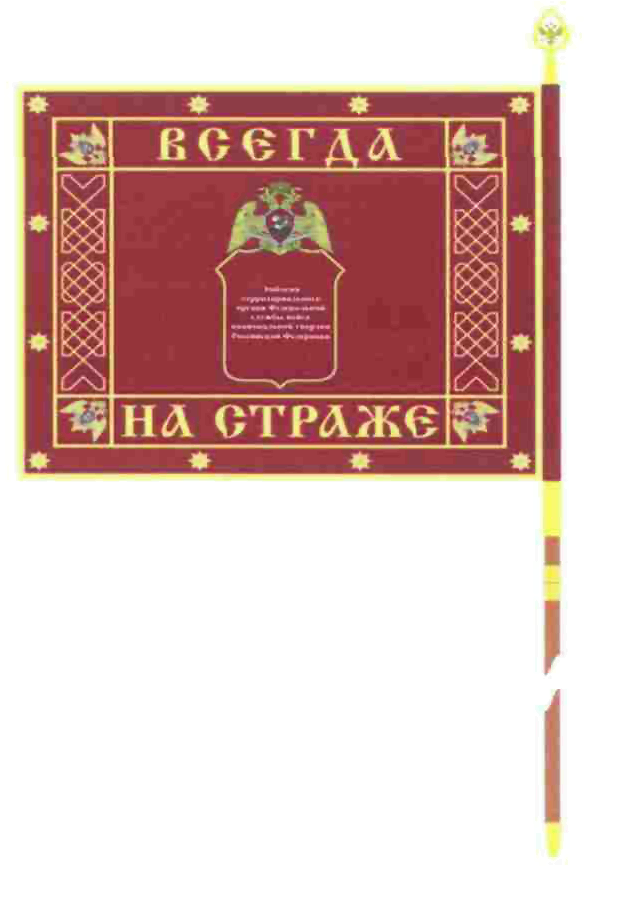 Полотнище знамени прямоугольное, крапового цвета, обшитое золотистой тесьмой (галуном). По периметру полотнища расположена рамка с золотистым плетеным орнаментом и - по углам - эмблемой войск национальной гвардии Российской Федерации. Вдоль краев полотнища симметрично расположены 12 декоративных золотых восьмилучевых звезд.