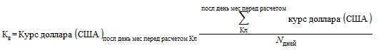 Кв - валютный коэффициент, учитывающий изменение курса доллара США и рассчитываемый одновременно с расчетом коэффициента локализации Кл посредством деления курса доллара США, действующего на последний день месяца, предшествующего месяцу расчета коэффициента локализации Кл, на средний курс доллара США за расчетный период (с 1 ноября прошлого года по последний день месяца, предшествующего месяцу расчета Кл) по формуле: