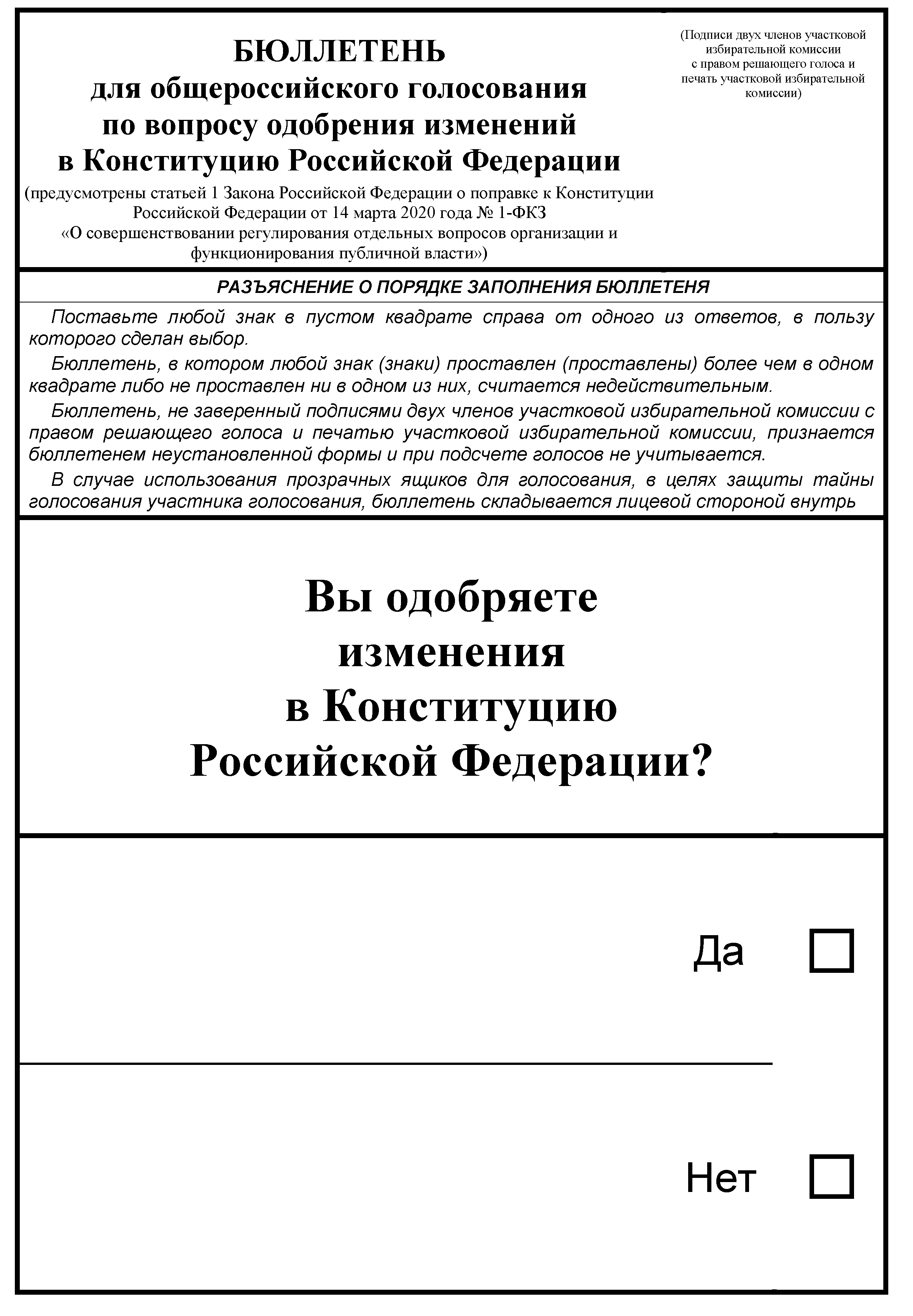 Бюллетень содержит всего 1 вопрос: "Вы одобряете изменения в Конституцию Российской Федерации?".