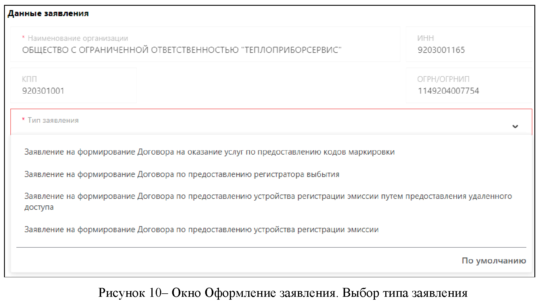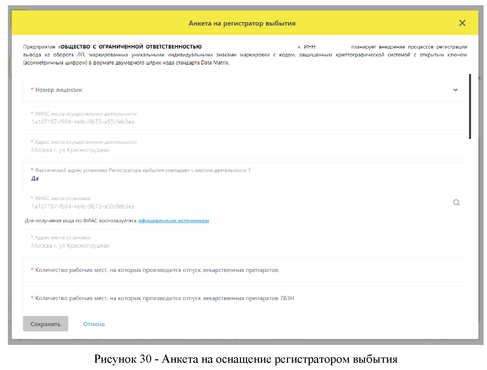 После нажатия на кнопку откроется окно для заполнения анкеты на оснащение регистратором выбытия выбранного места деятельности (Рисунок 30).