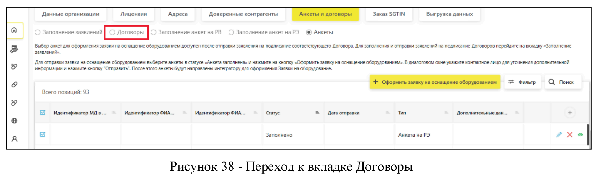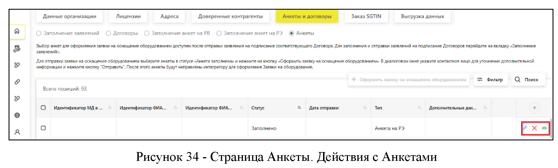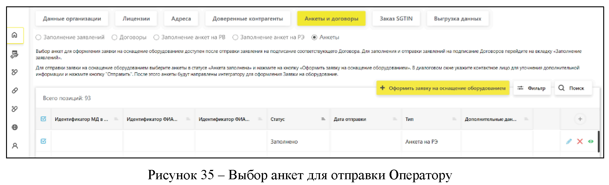 Отметить анкеты в статусе "Заполнено" галочкой и нажать кнопку "Оформить заявку на оснащение оборудованием".