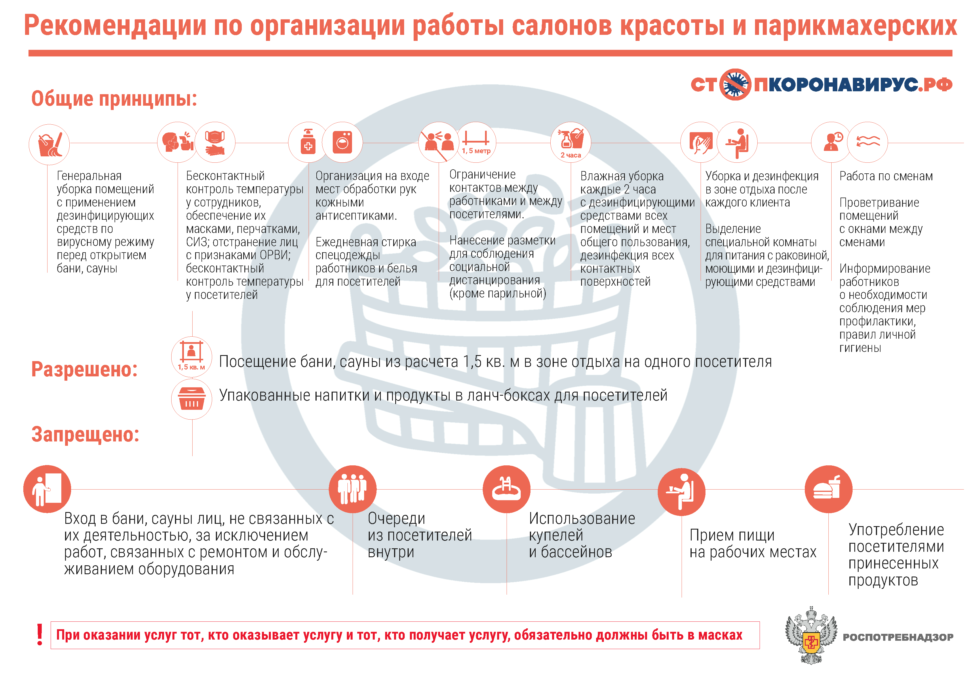 Предусмотрены организация посещения из расчета 1,5 кв. м в зоне отдыха на одного посетителя, бесконтактный контроль температуры у клиентов, ношение сотрудниками и посетителями масок (для сотрудников исключение - парильные), для соблюдения социальной дистанции в 1,5 метра нанесение разметки во всех помещениях, кроме парильной, предоставление клиентам только упакованных напитков и еды.