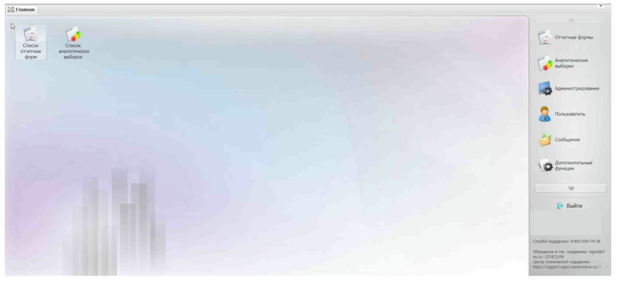В главном окне Системы на рабочем столе должен отобразиться ярлык «Список отчетных форм». Если данный ярлык не отображается, обратитесь в службу технической поддержки одним из следующих способов: