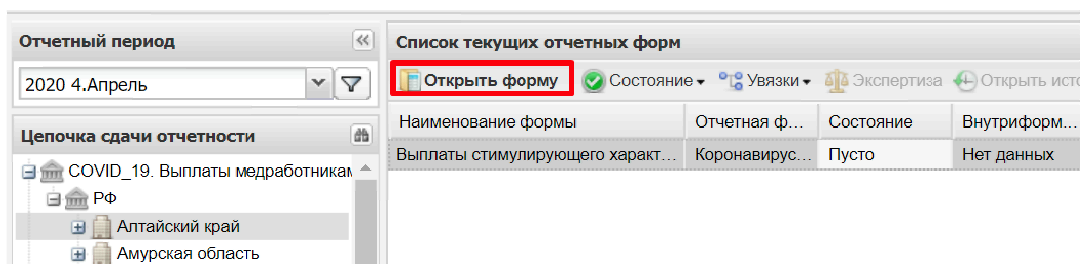 - в области «Список отчетных форм» двойным нажатием левой кнопки мыши открыть форму «Выплаты стимулирующего характера» либо, выделив строку с названием формы, кликнуть на кнопку «Открыть форму» (Рисунок 6).