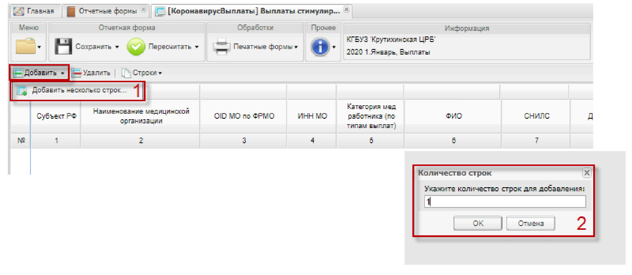 С помощью кнопки «Добавить» (1, Рисунок 8) возможно добавление одной или нескольких строк на вкладке «Выплаты» (2, Рисунок 8).