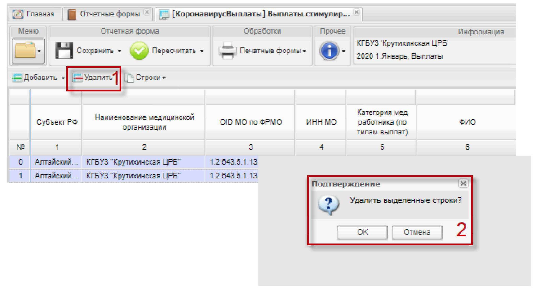 С помощью кнопки «Удалить» (1, Рисунок 9) возможно удаление выделенных строк на вкладке «Выплаты» (2, Рисунок 9).