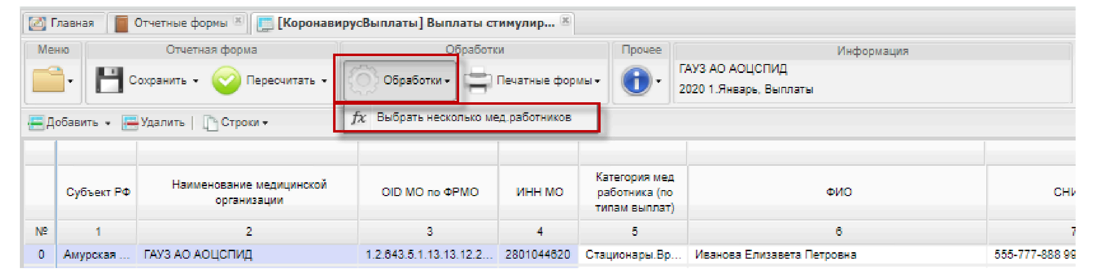 На панели инструментов можно воспользоваться функцией «Обработки/Выбрать несколько мед. работников» (Рисунок 9).