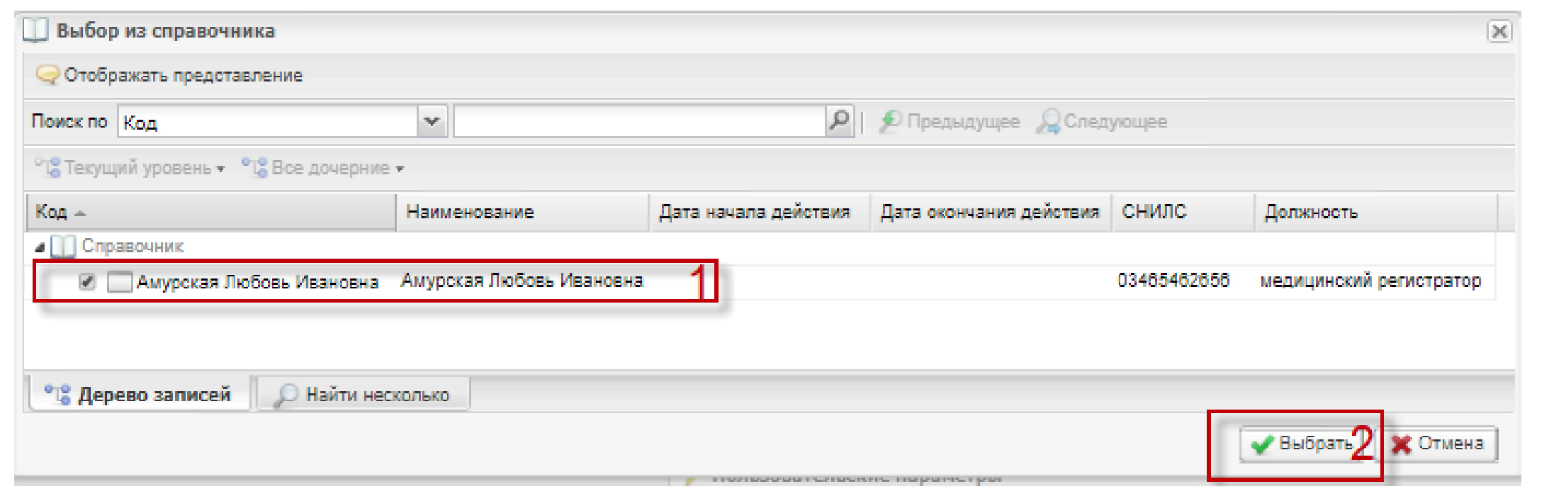Выбор мед. работников осуществляется из справочника, путем проставления галочек в окне нужной строки (1, Рисунок 12) и нажатием на кнопку «Выбрать» (2, Рисунок 12).