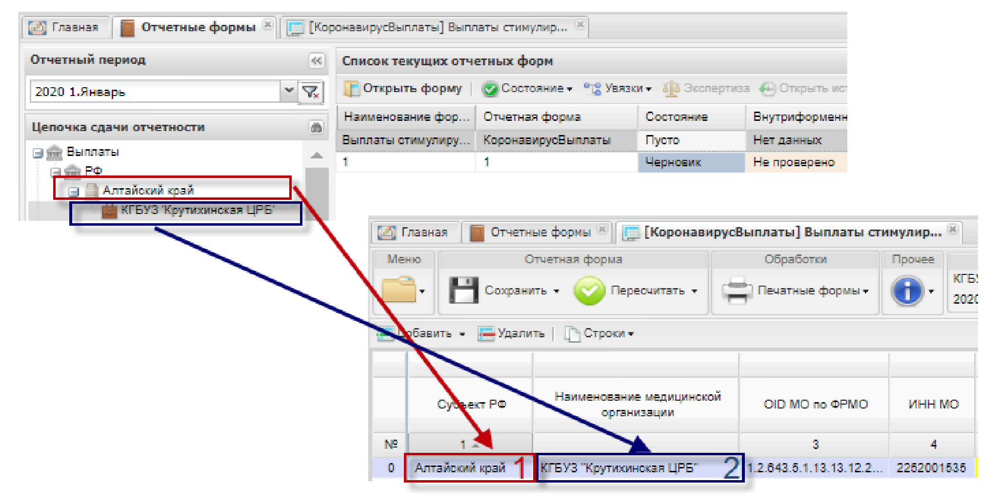 «Субъект РФ» (1, Рисунок 13) и «Наименование медицинской организации» (2, Рисунок 13) выбирается из цепочки учреждений, по которому заполняется отчетная форма.