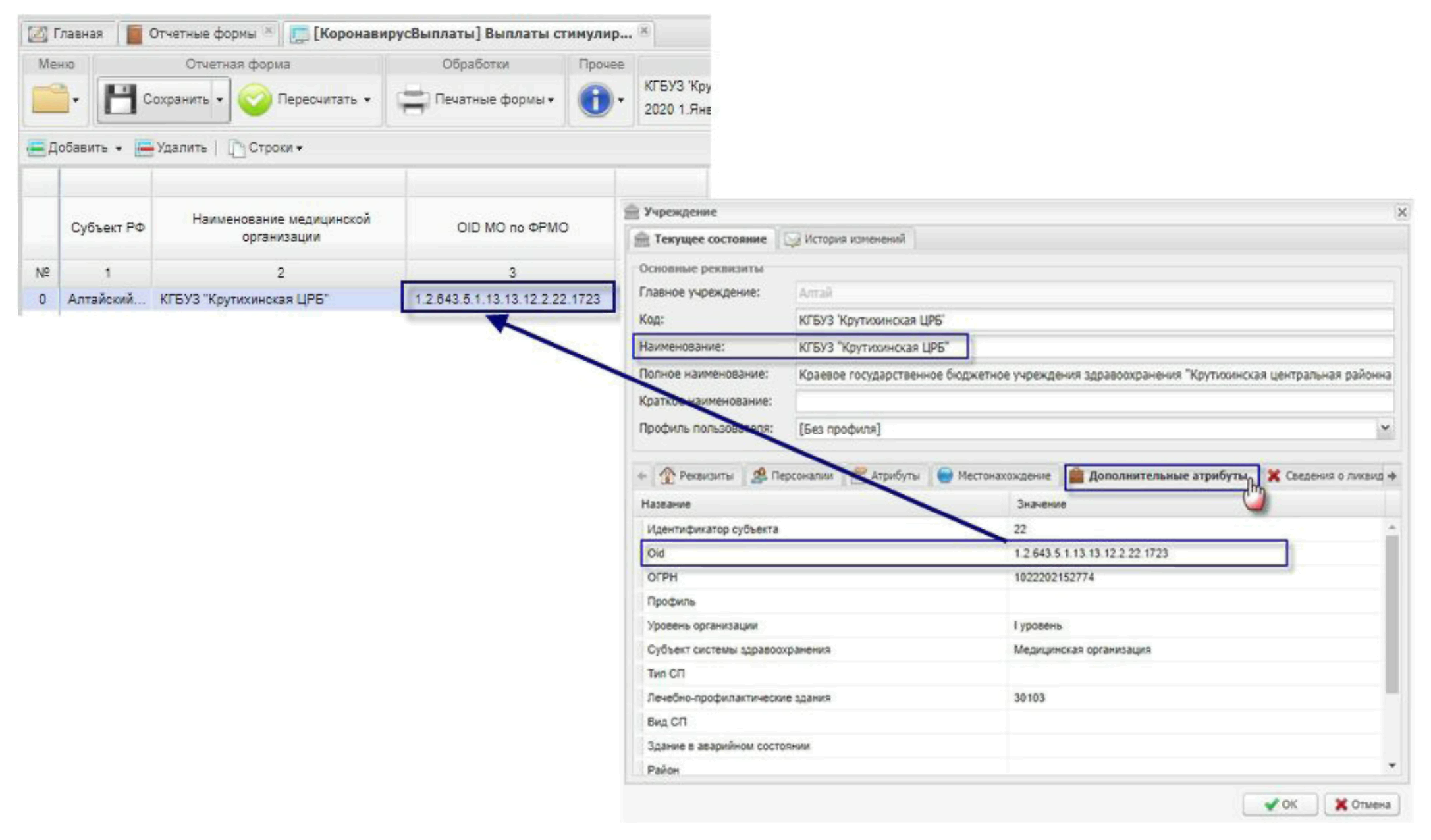 По столбцу «OID MO по ФРМО» код медицинской организации заполняется автоматически из карточки учреждения из вкладки «Дополнительные атрибуты» (Рисунок 14).