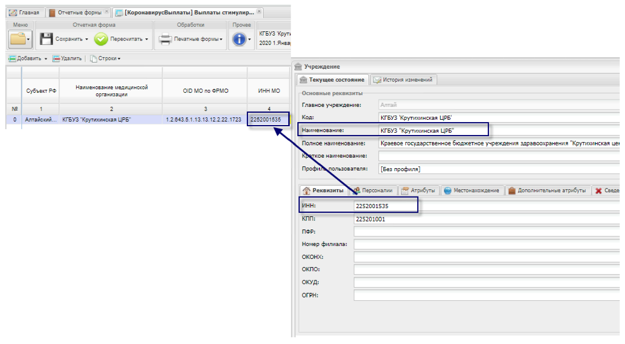 Столбец «ИНН МО» заполняется автоматически из карточки учреждения из вкладки «Реквизиты» (Рисунок 15).