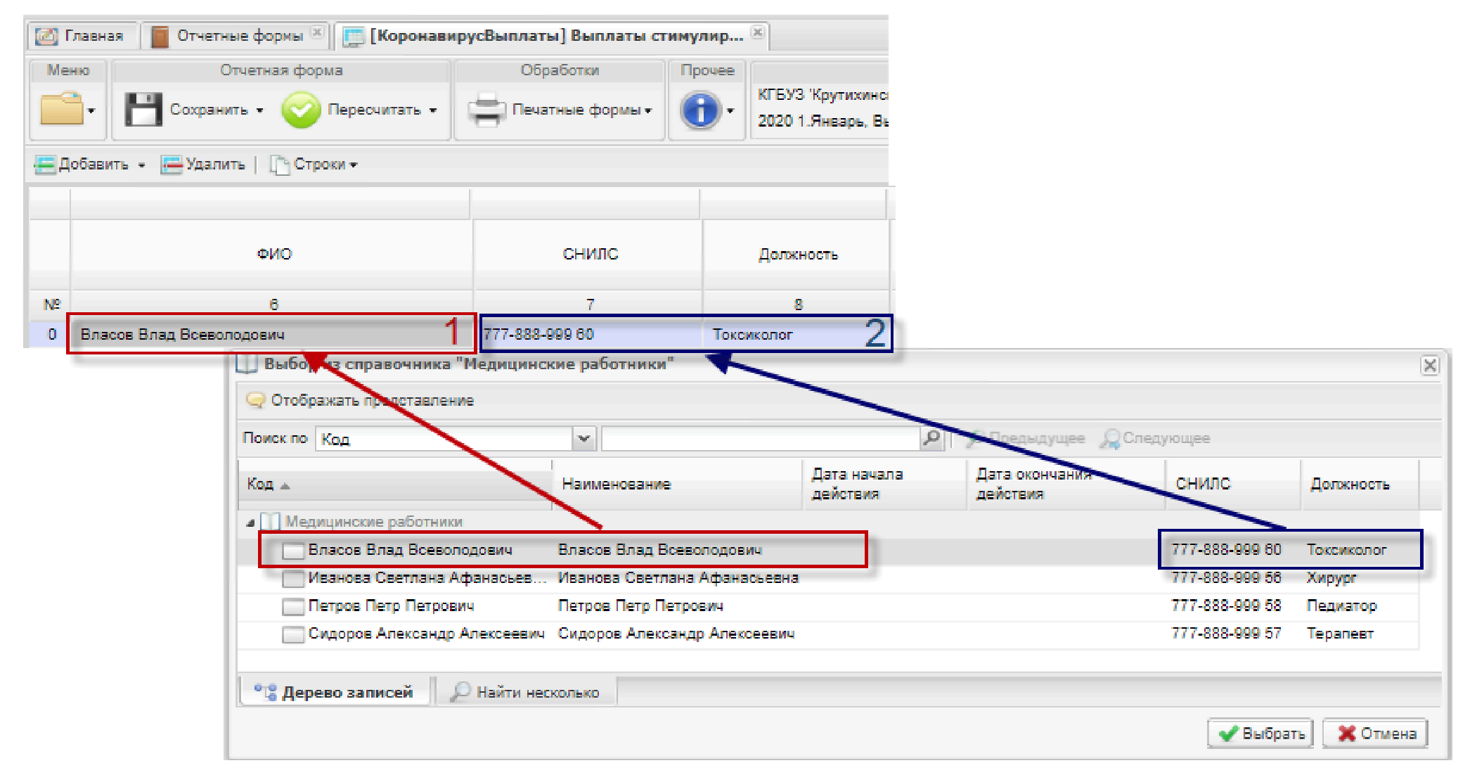 Выбираем нужного медицинского работника (1, Рисунок 13) путем двойного клика по строке и нажатия на кнопку «Выбрать» (2, Рисунок 13) добавляем его в таблицу.