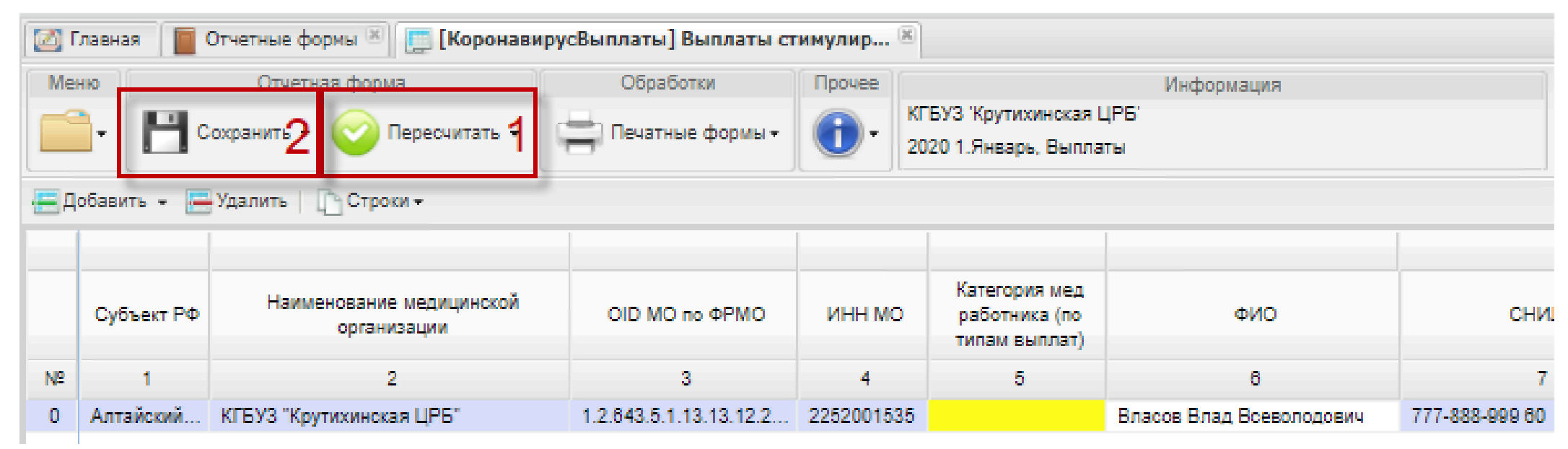 После внесения всех данных и выполнения расчета форму необходимо сохранить. Для этого на панели инструментов нажать на кнопку «Сохранить» (2, Рисунок 15)