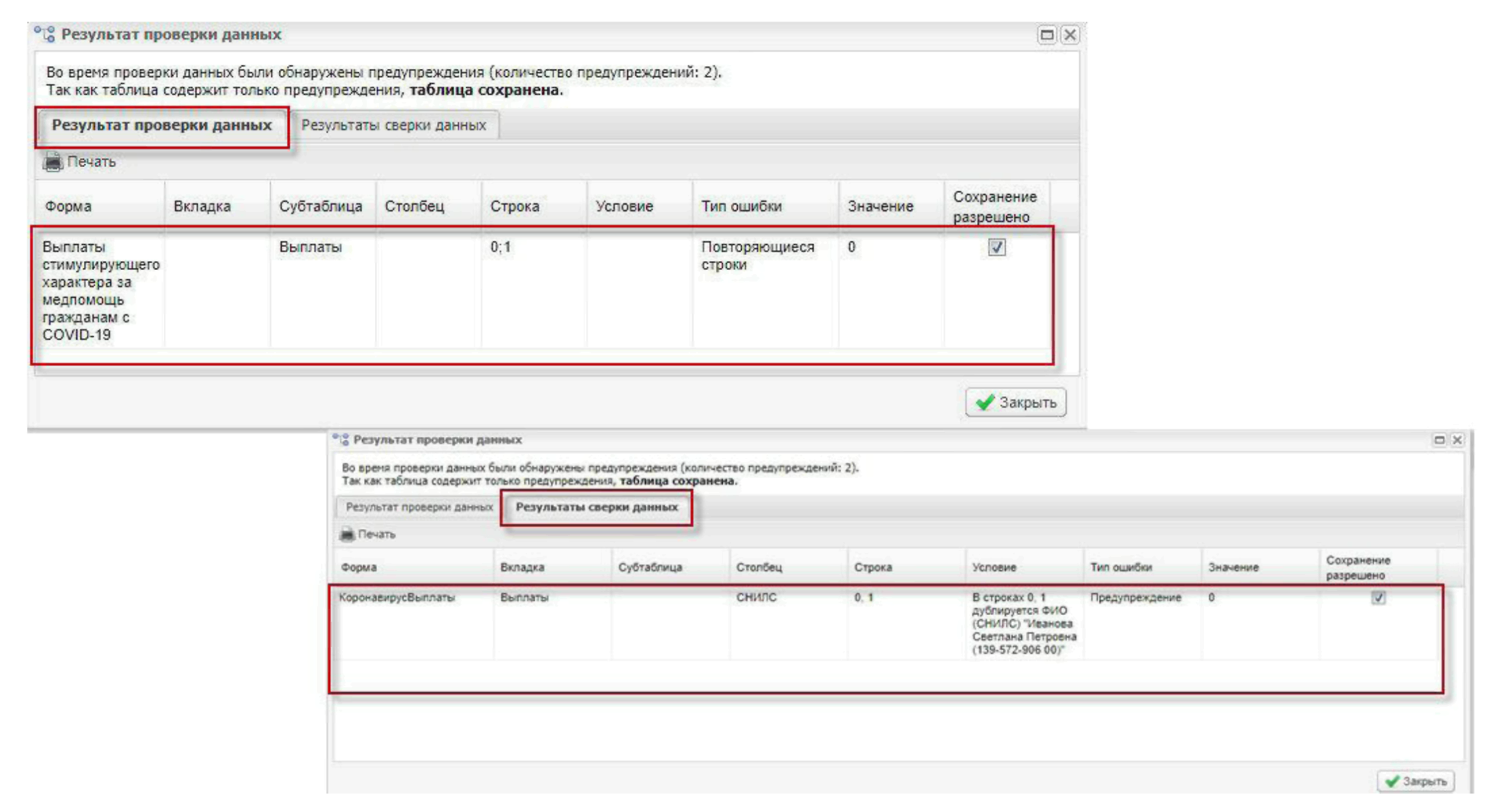 При сохранении формы проводится проверка данных по столбцу «СНИЛС»