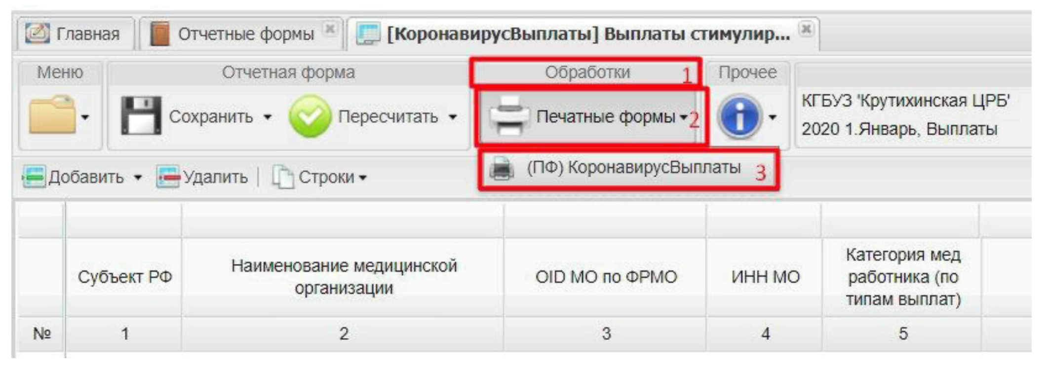 Данные таблицы на вкладке «Выплаты» можно выгрузить на бумажный носитель. Для этого на панели инструментов в блоке «Обработки» (1, Рисунок 22) нажать на кнопку «Печатные формы» (2, Рисунок 22) - (ПФ) Коронавирус Выплаты (3, Рисунок 22).