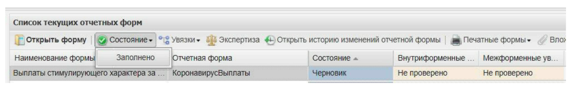 На вкладке «Отчетные формы» в списке выделите строку отчетной формы. На панели инструментов выберите пункт «Состояние». Будет доступно только значение «Заполнено». Нажмите на это значение. (Рисунок 24 Ошибка! Источник ссылки не найден.).