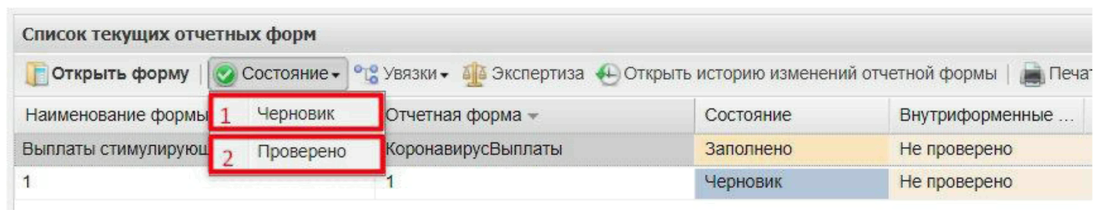 Чтобы работа с формой перешла на следующий этап - на панели инструментов нажмите на кнопку «Состояние» и из двух доступных значений выберите значение «Проверено» (1, Рисунок 28).