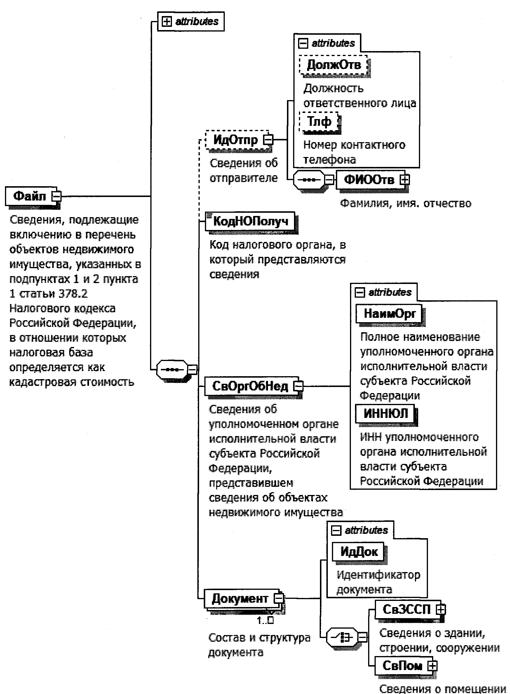 Формат представления сведений, подлежащих включению в перечень объектов недвижимого имущества, указанных в подпунктах 1 и 2 пункта 1 статьи 378.2 Налогового кодекса Российской Федерации, в отношении которых налоговая база определяется как кадастровая стоимость, в электронной форме
