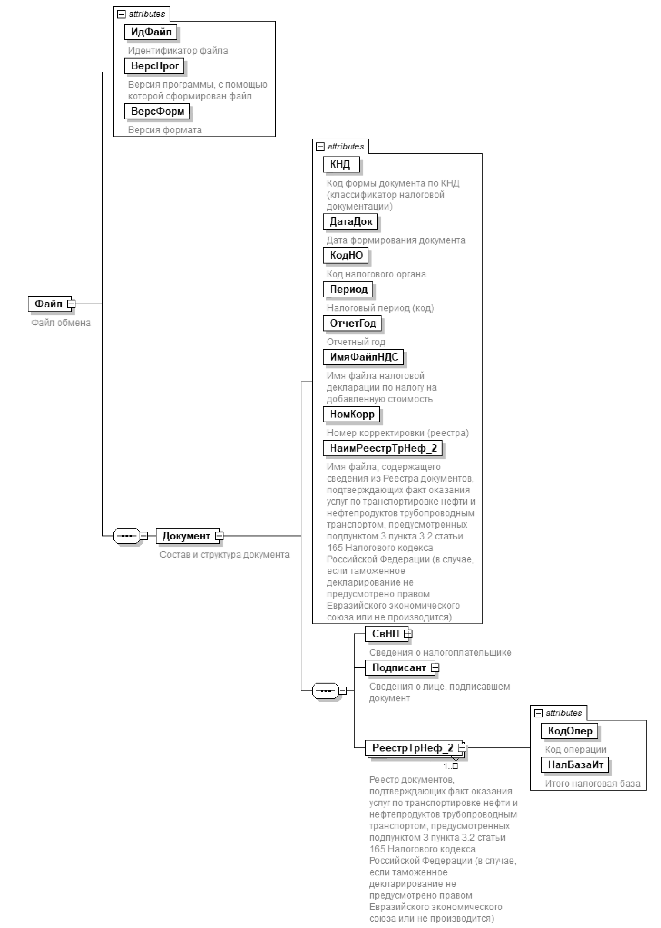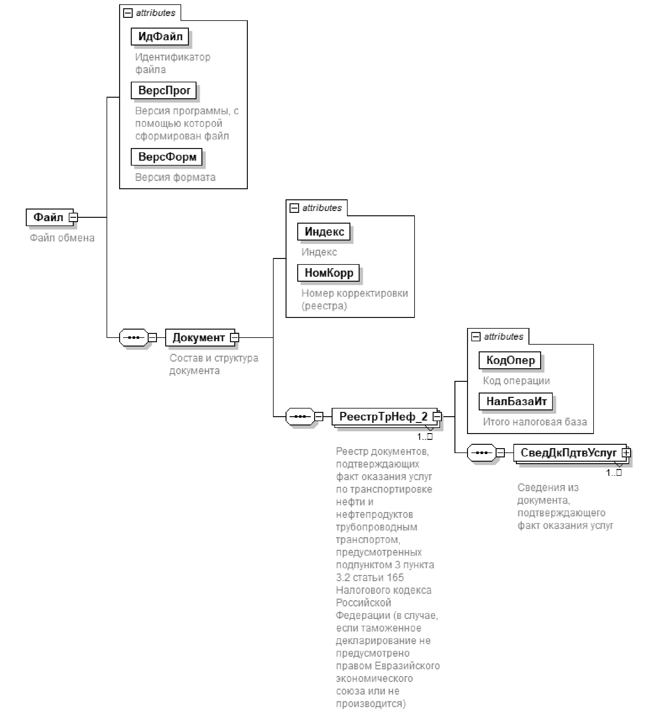 | Реестр документов, подтверждающих факт оказания услуг по транспортировке нефти и нефтепродуктов трубопроводным транспортом, предусмотренных подпунктом 3 пункта 3.2 статьи 165 Налогового кодекса Российской Федерации (в случае, если таможенное декларирование не предусмотрено правом Евразийского экономического союза или не производится) | РеестрТрНеф_2 | С | ОМ | Состав элемента представлен в таблице 5.3 |