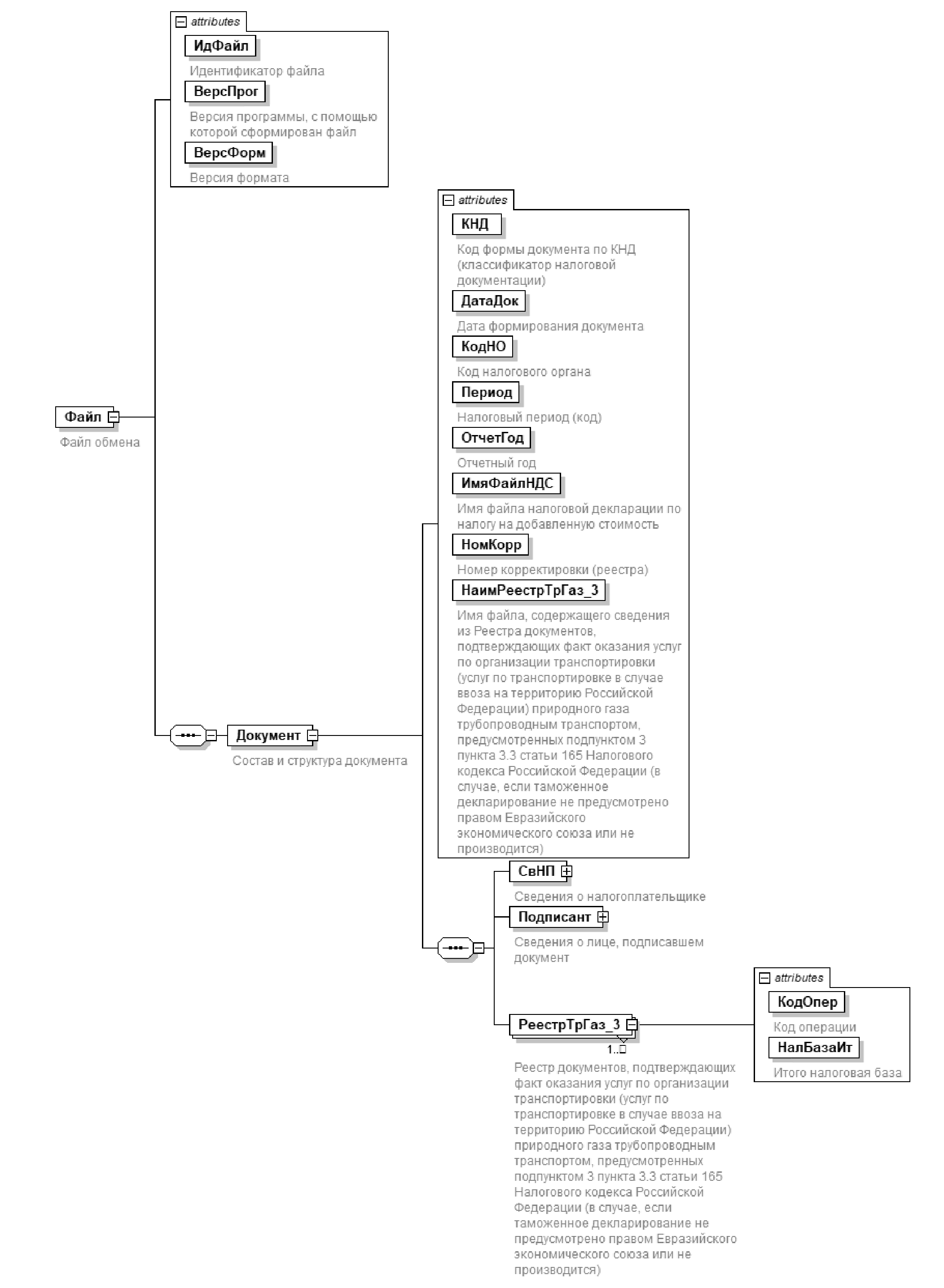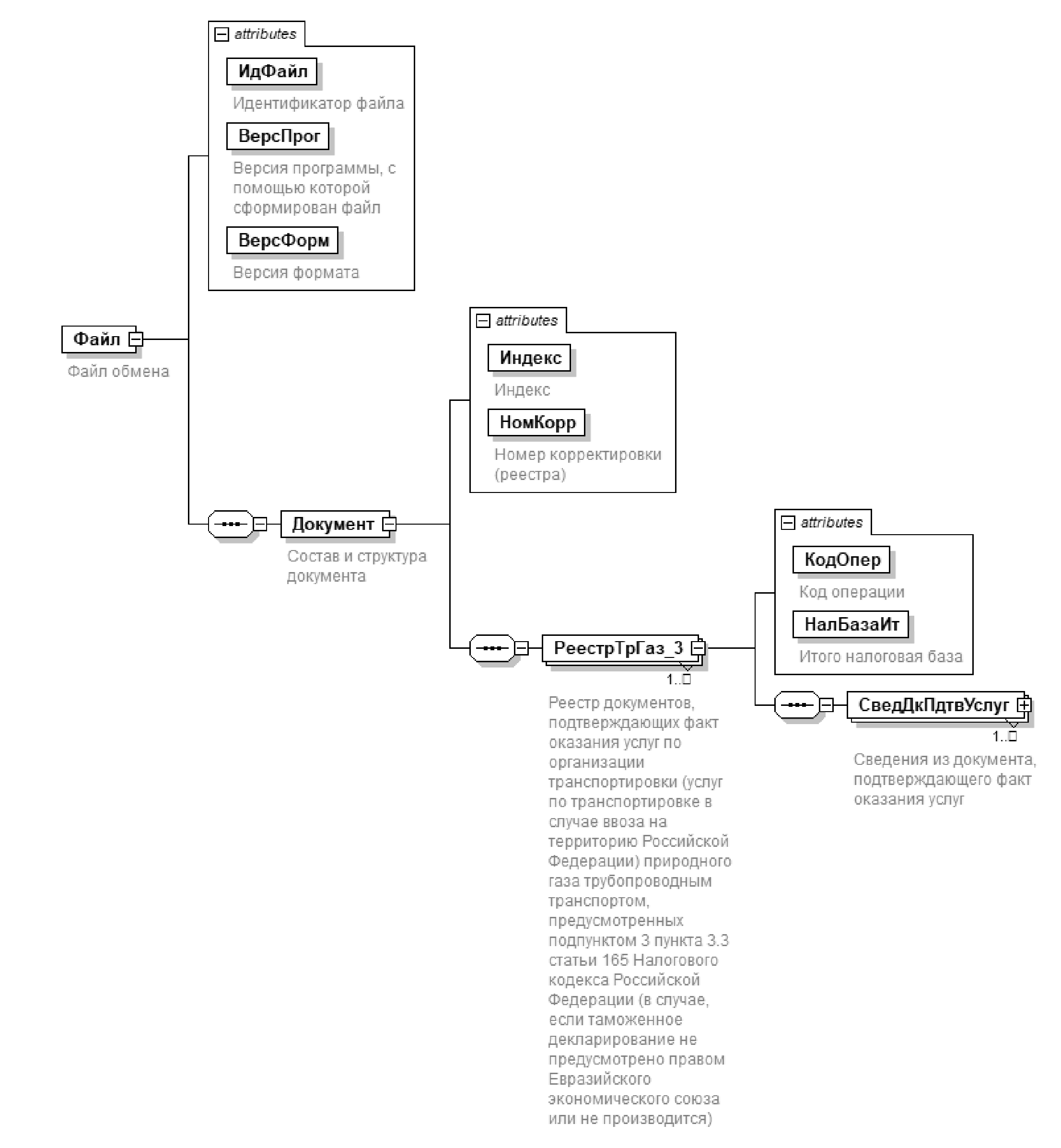 | Реестр документов, подтверждающих факт оказания услуг по организации транспортировки (услуг по транспортировке в случае ввоза на территорию Российской Федерации) природного газа трубопроводным транспортом, предусмотренных подпунктом 3 пункта 3.3 статьи 165 Налогового кодекса Российской Федерации (в случае, если таможенное декларирование не предусмотрено правом Евразийского экономического союза или не производится) | РеестрТрГаз_3 | С | ОМ | Состав элемента представлен в таблице 3.9 |
