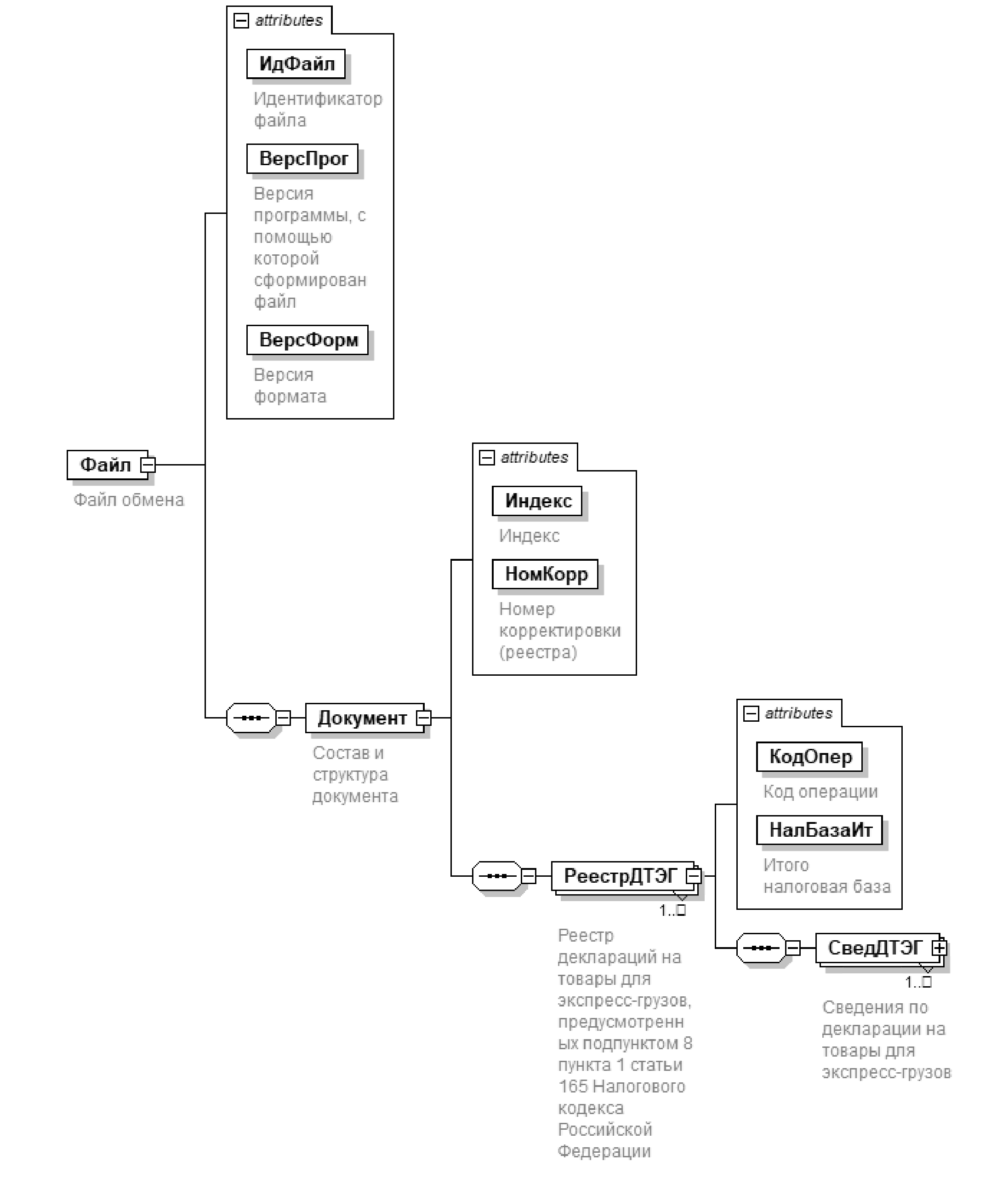 | Реестр деклараций на товары для экспресс-грузов, предусмотренных подпунктом 8 пункта 1 статьи 165 Налогового кодекса Российской Федерации | РеестрДТЭГ | С | ОМ | Состав элемента представлен в таблице 5.3 |