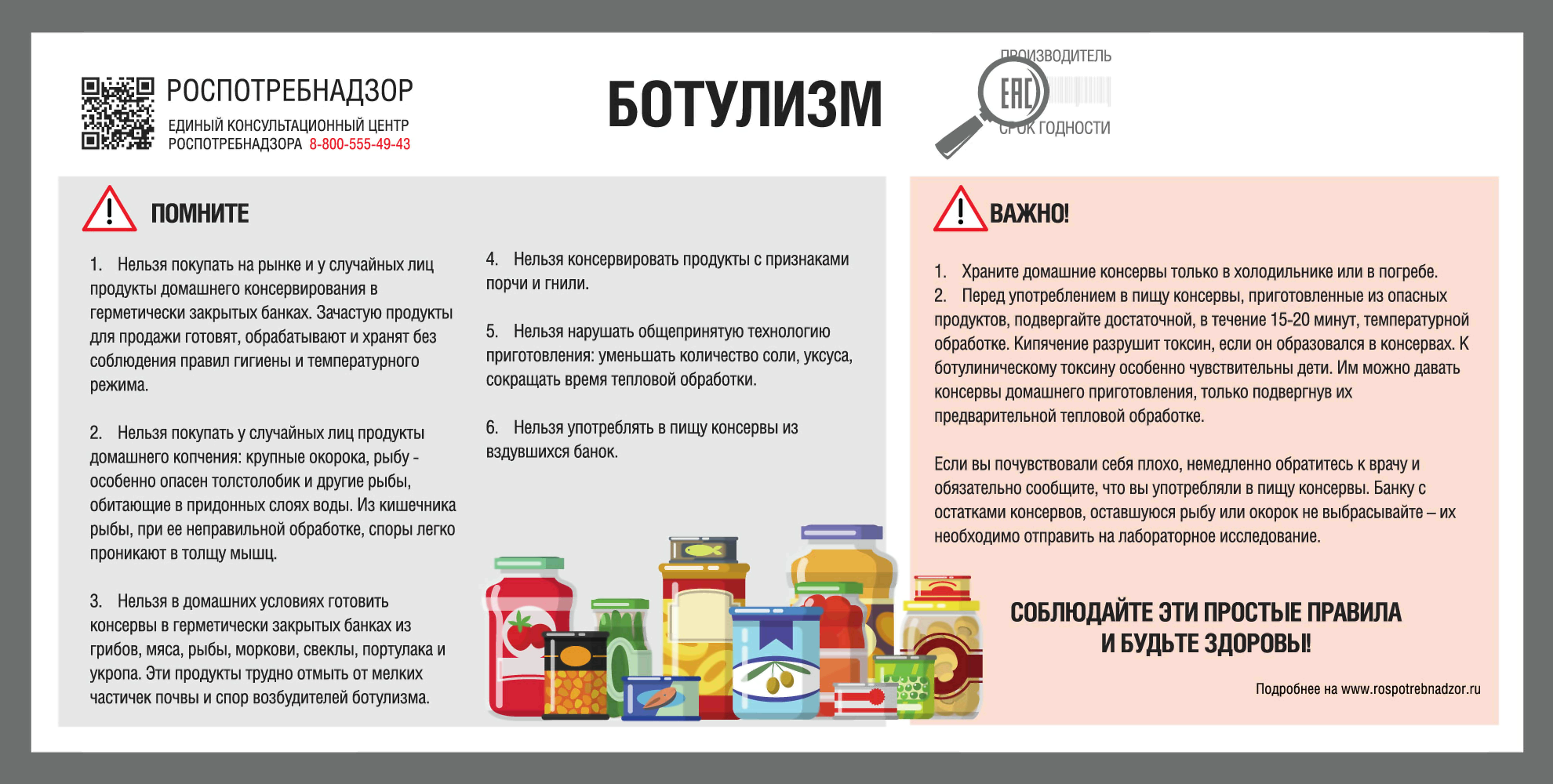 В период активной заготовки домашних консервов и продуктов на зиму Роспотребнадзор напоминает, что ботулизм - тяжелое заболевание, поражающее центральную нервную систему, и при несвоевременном обращении за помощью, заканчивается летальным исходом. В среднем каждый год от ботулизма страдает около 200 человек. В I полугодии 2020 г. от ботулизма пострадало 60 человек из них с 6 летальным исходом (10%).