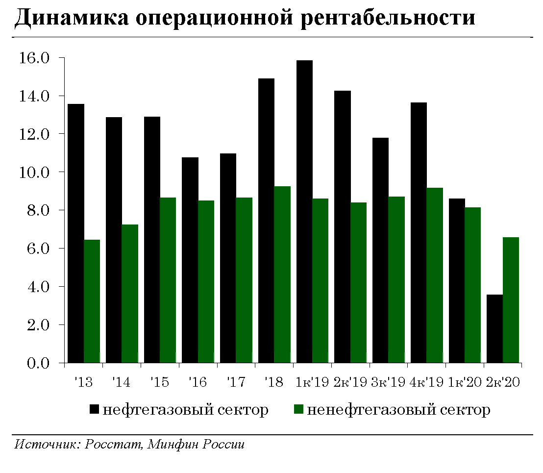 Операционная рентабельность ненефтегазового сектора, хоть и снизилась по итогам 2 квартала 2020 года, остаётся на уровне, не представляющем угрозы для финансовой устойчивости как самого сектора, так и кредиторов (учитывая в том числе невысокий уровень долговой нагрузки).