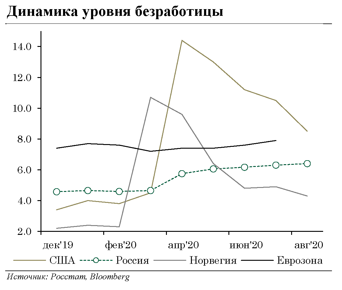 - Ситуация на рынке труда остаётся под контролем. Уровень безработицы увеличился с 4,6% в марте до 6,4% в августе, что безусловно свидетельствует о повышенной напряженности, однако не представляется критическим уровнем как в историческом контексте (в кризис 2008 - 2009 гг. безработица превышала 9%), так и в сравнении с другими странами. Сдержанному росту безработицы, в том числе, способствует реализация программ грантовой и кредитной поддержки пострадавших отраслей, обуславливающие предоставление субсидий сохранением занятости.
