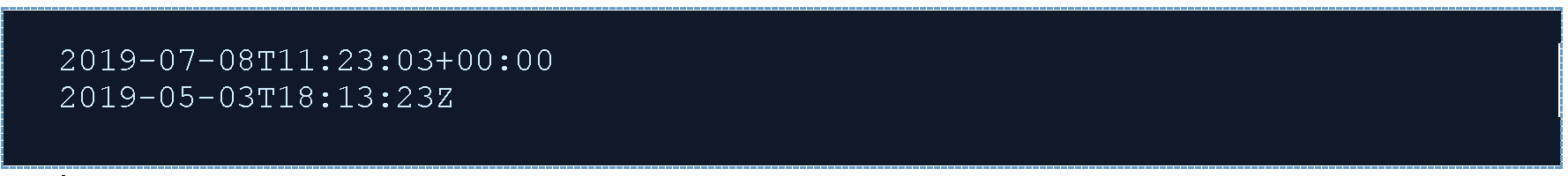 Все даты в полезных нагрузках JSON представлены в формате date-time стандарта ISO 8601. Все поля date-time в ответах включают часовой пояс. Например: