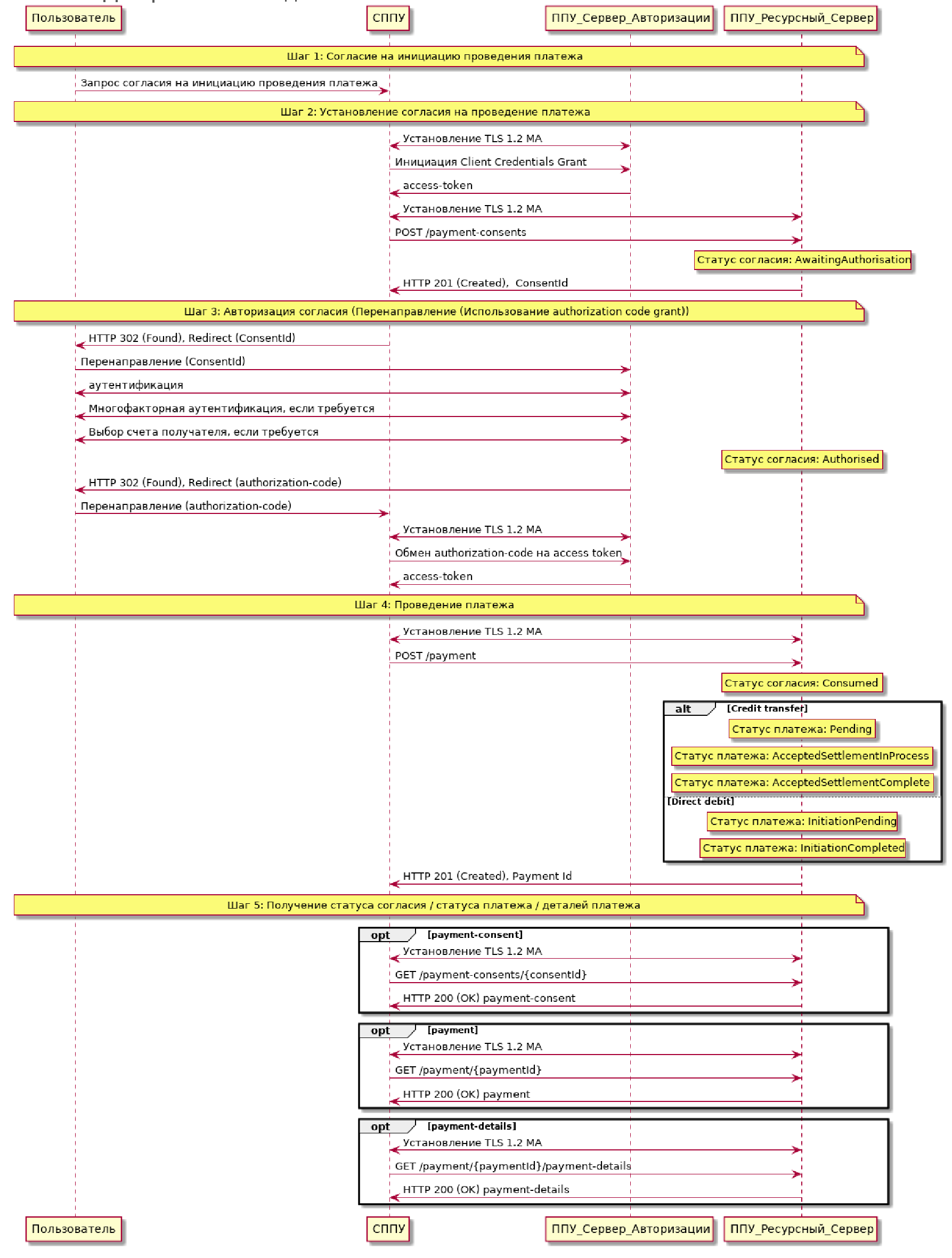 Запрос POST /payment. СППУ, получив согласие Пользователя на проведение платежа, дополняет платежную инструкцию идентификатором согласия "сonsentId": "58923" и создает на стороне ППУ ресурс платежа вызовом конечной точки POST /payments.