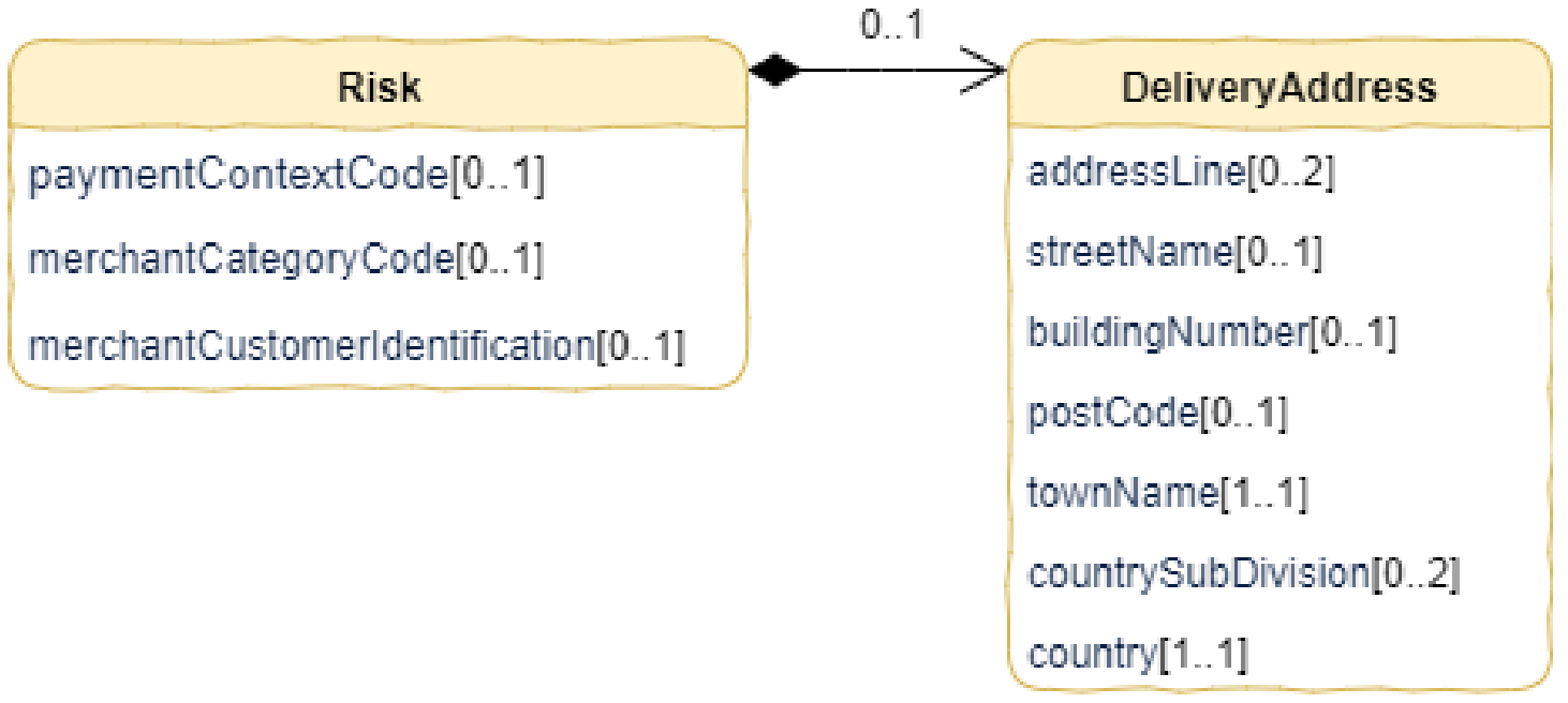| Risk | 1..1 | PaymentRequest/Risk | Раздел "Risk" отправляется инициатором в ППУ, используется для указания дополнительных деталей для оценки рисков при проведении платежей. | RiskComplexType |