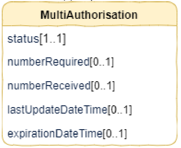 - Объект "MultiAuthorisation", если для ресурса платежей требуется множественная авторизация.